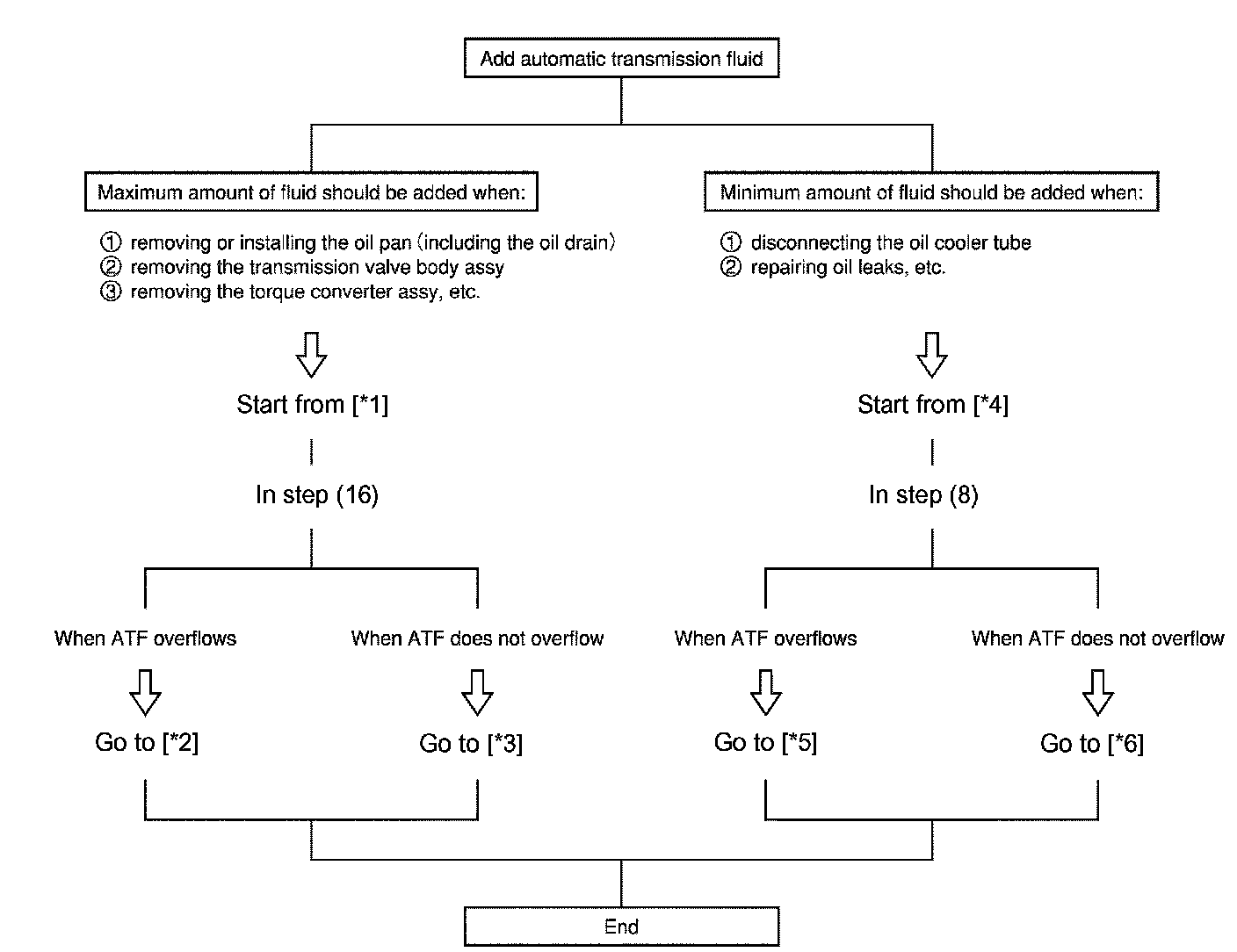 8. Remove the overflow plug. If ATF overflows, proceed to [*5]. If ATF does not overflow, proceed to [*6].