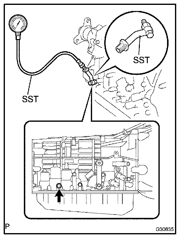 3. Remove the test plug on the transmission case center right side and connect SST.