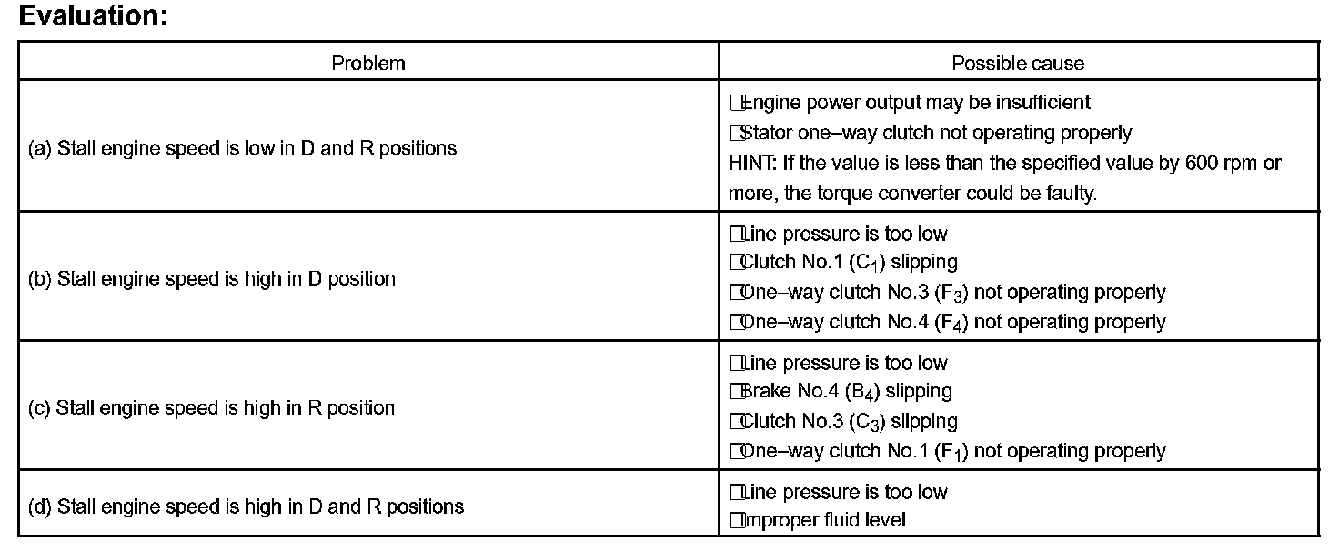 The object of this test is to check the overall performance of the transmission and engine by measuring the stall speeds in the D and R positions.