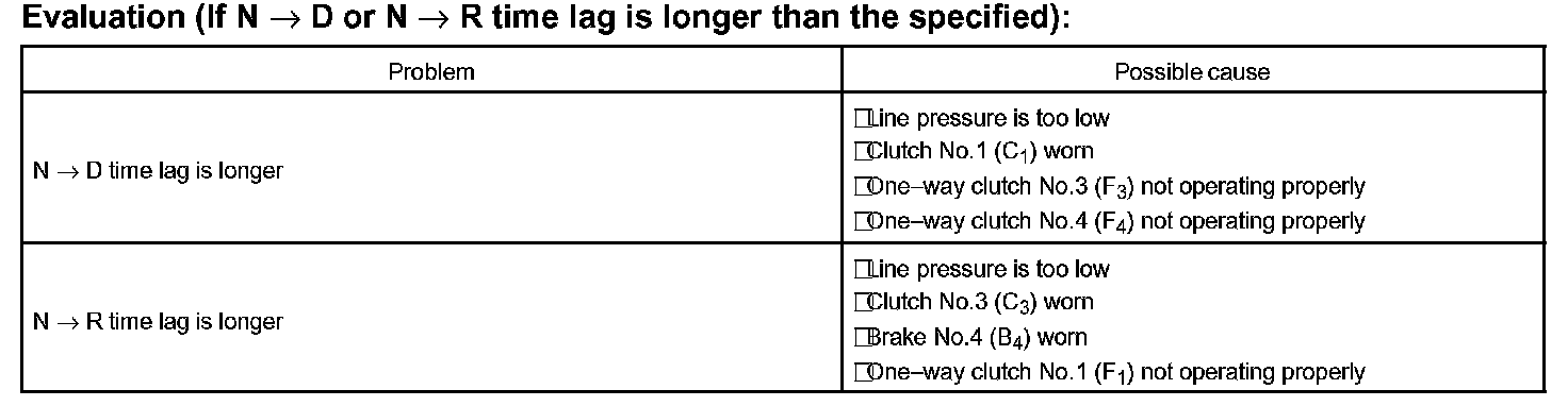 1. When the shift lever is shifted while the engine is idling, there will be a certain time lapse or lag before the shock can be felt. This is used for checking the condition of the direct clutch, forward clutch, and 1st and reverse brake.