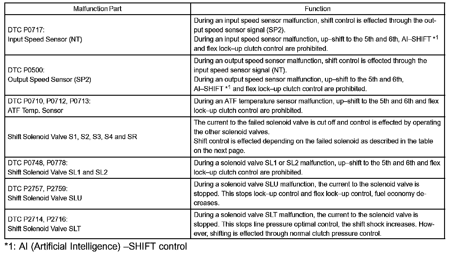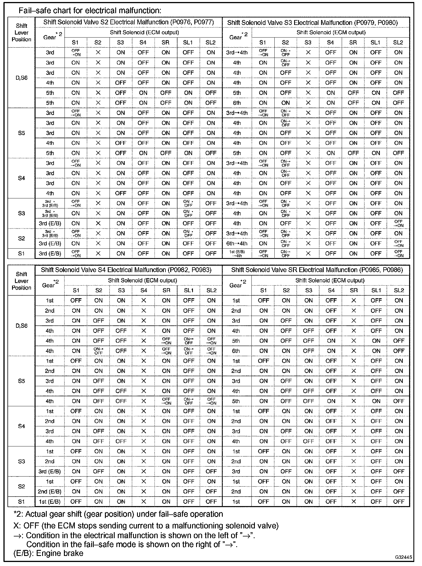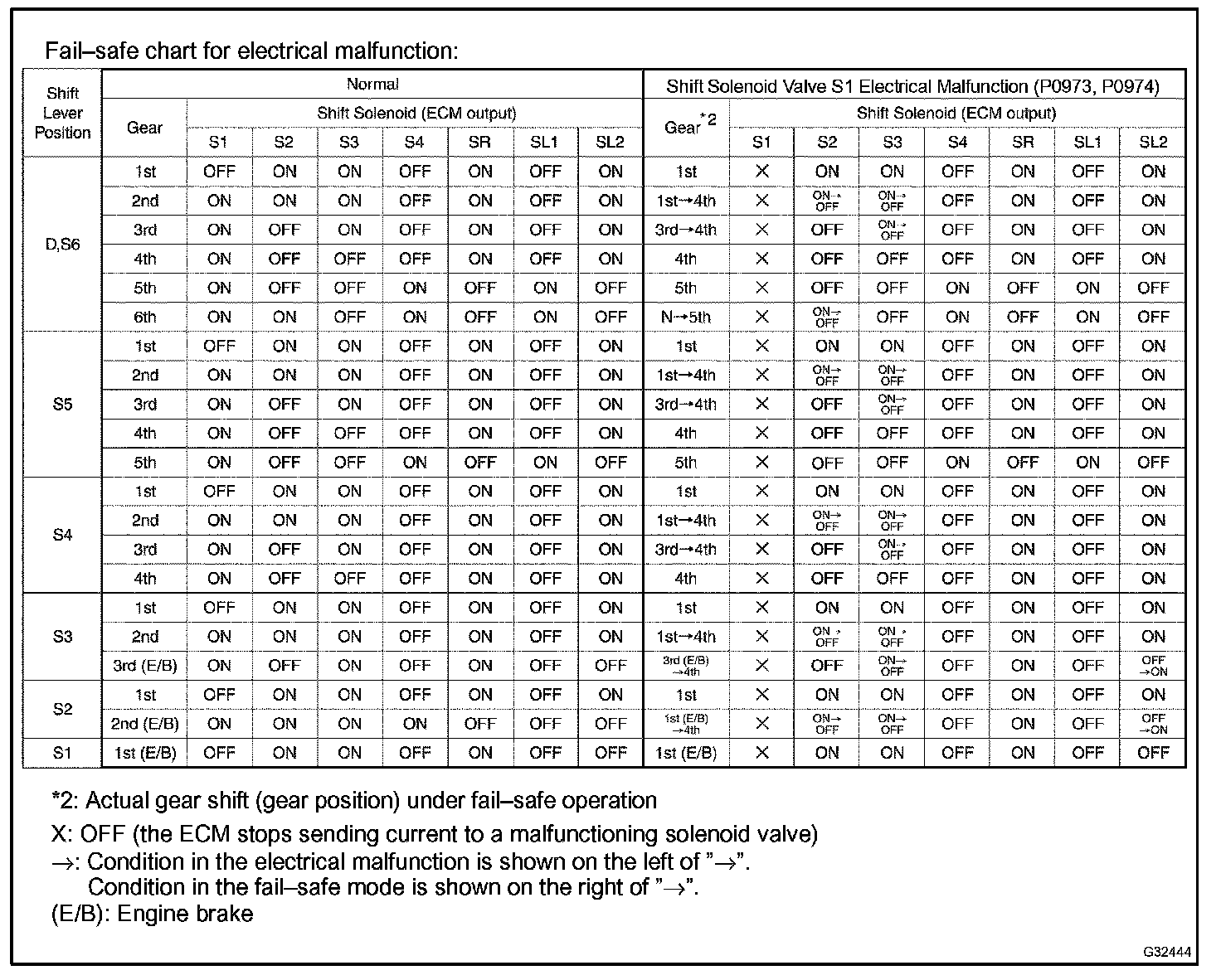 If either of the shift solenoid valve circuits has an open or short failure, the ECM turns the other shift solenoid "ON" and "OFF" in order to shift into the gear positions shown in the table.