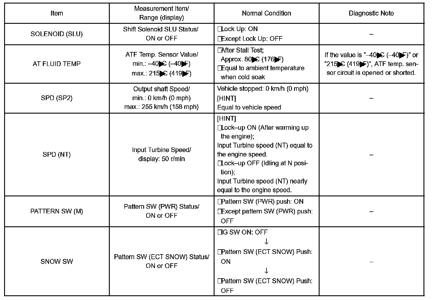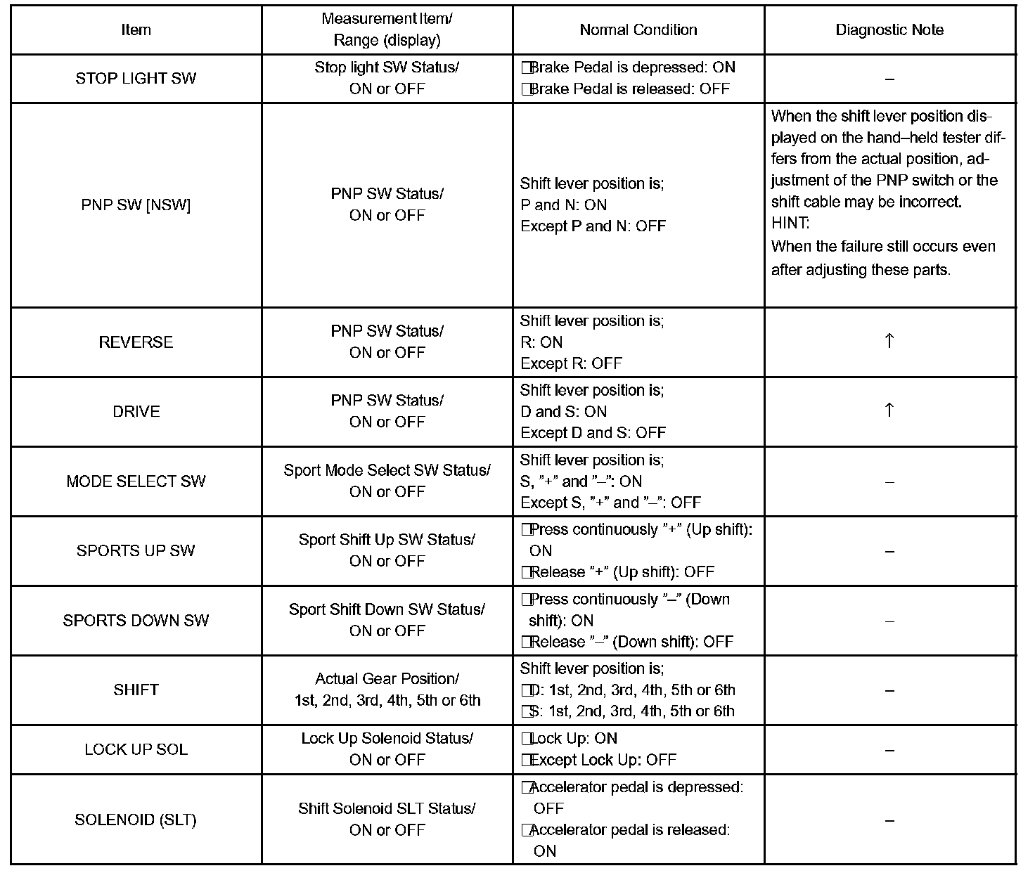 HINT: According to the DATA LIST displayed by the hand-held tester, you can read the value of the switch, sensor, actuator and so on without parts removal. Reading the DATA LIST as the first step of troubleshooting is one method to shorten labor time.
