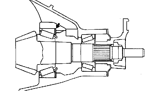 ^ Approximately 0.1 mm (0.004 inch) clearance between the side bearing (outer race) and the side gear shaft shaft snap ring is sufficient enough for the washer to move slightly.