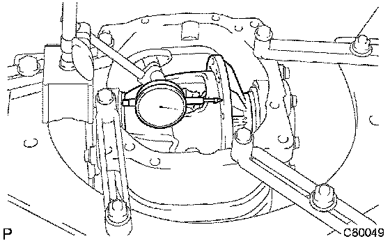 b. Place a dial indicator on the tip of the pinion gear tooth at a right angle. Hold the side gear in the differential case and check that the backlash is 0 mm (0 inch).