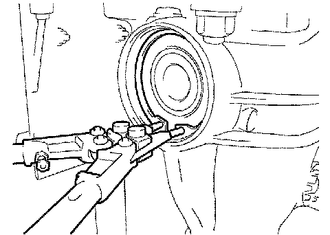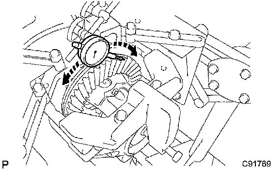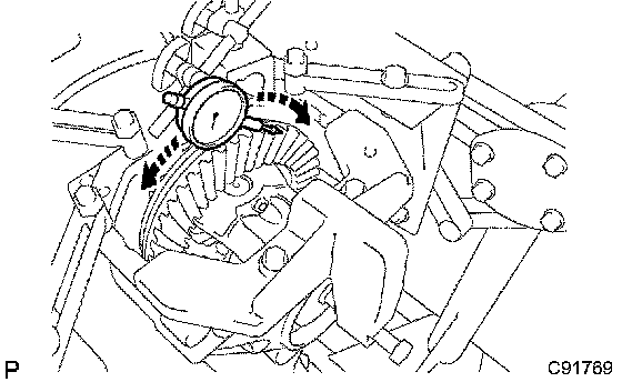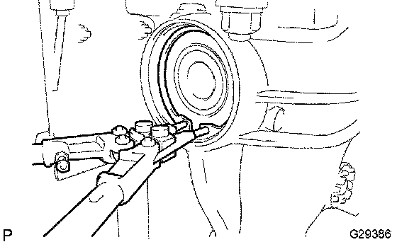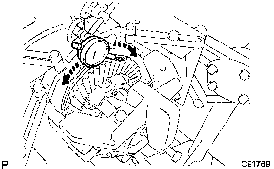 HINT: Set the dial indicator to the rearmost position (upper side in the illustration) of the area around where the side oil seal tapped in.