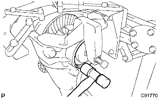 g. Using SST and a hammer, create a clearance between the side shaft shaft snap ring on the ring gear side and outer race.