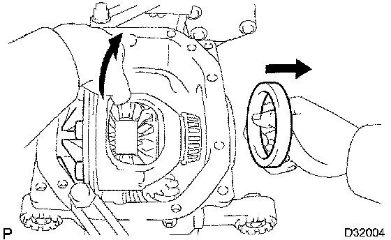 a. Raise the ring gear side of the differential case slightly to remove the drive pinion side outer race.