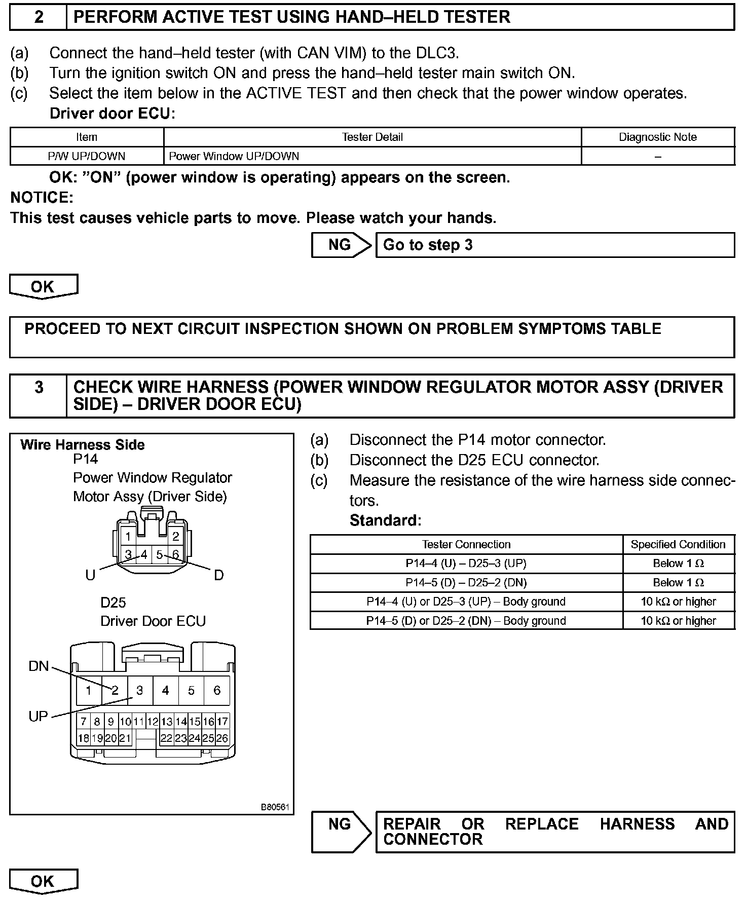 The driver door ECU receives signals from the power window regulator master switch assembly to operate the power window regulator motor.