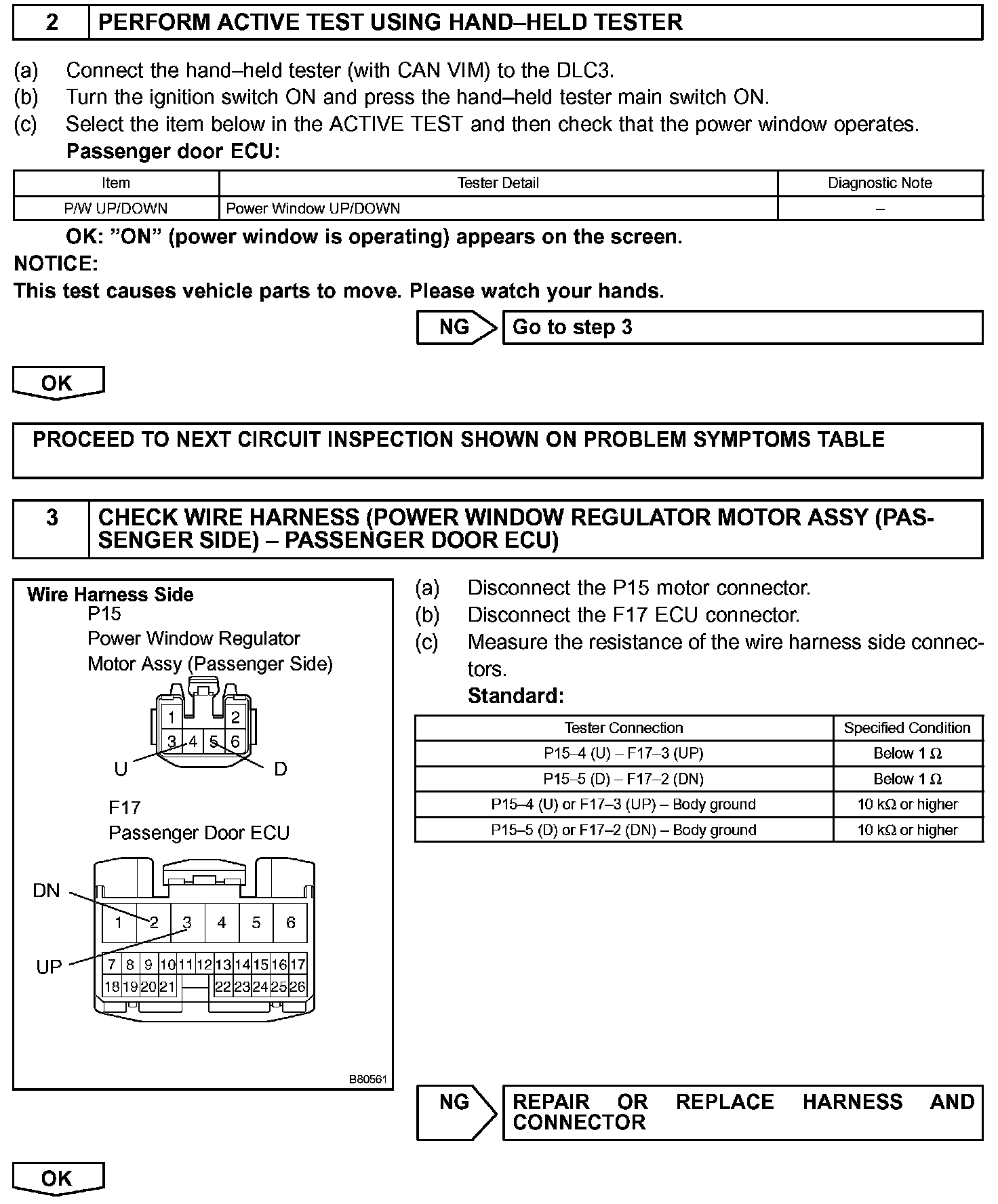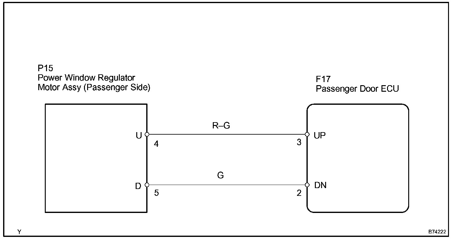 The passenger door ECU receives signals from the power window regulator master switch assembly and power window regulator switch assembly front RH to operate the power window regulator motor.