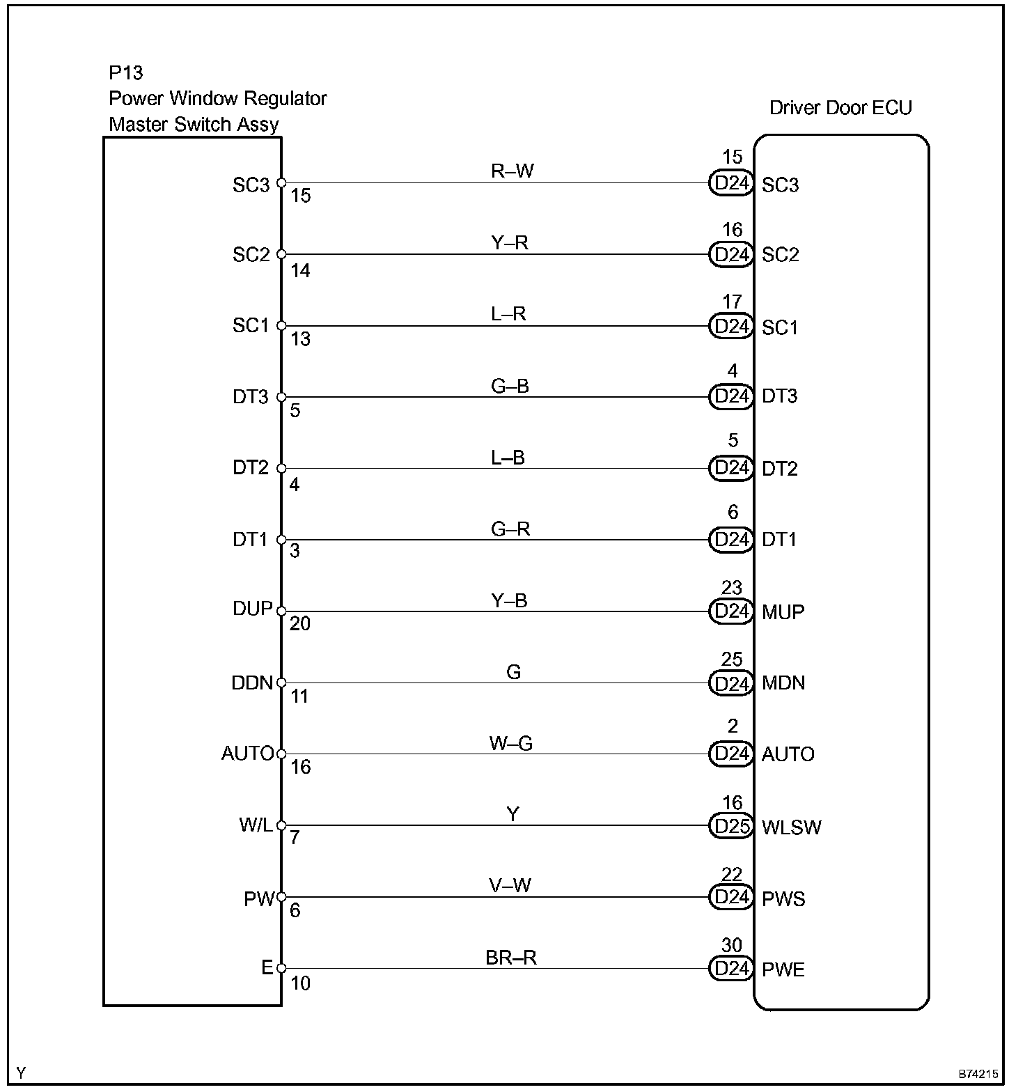 This circuit transmits signals from the power window master switch assembly to the driver door ECU.