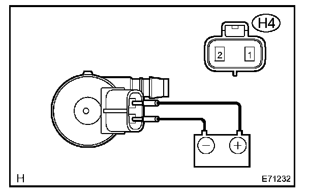 2. Connect the positive battery (+) lead to terminal 2 of the windshield washer motor and pump assy, and the negative battery (-) lead to terminal 1. Check that washer fluid flows from the washer jar.