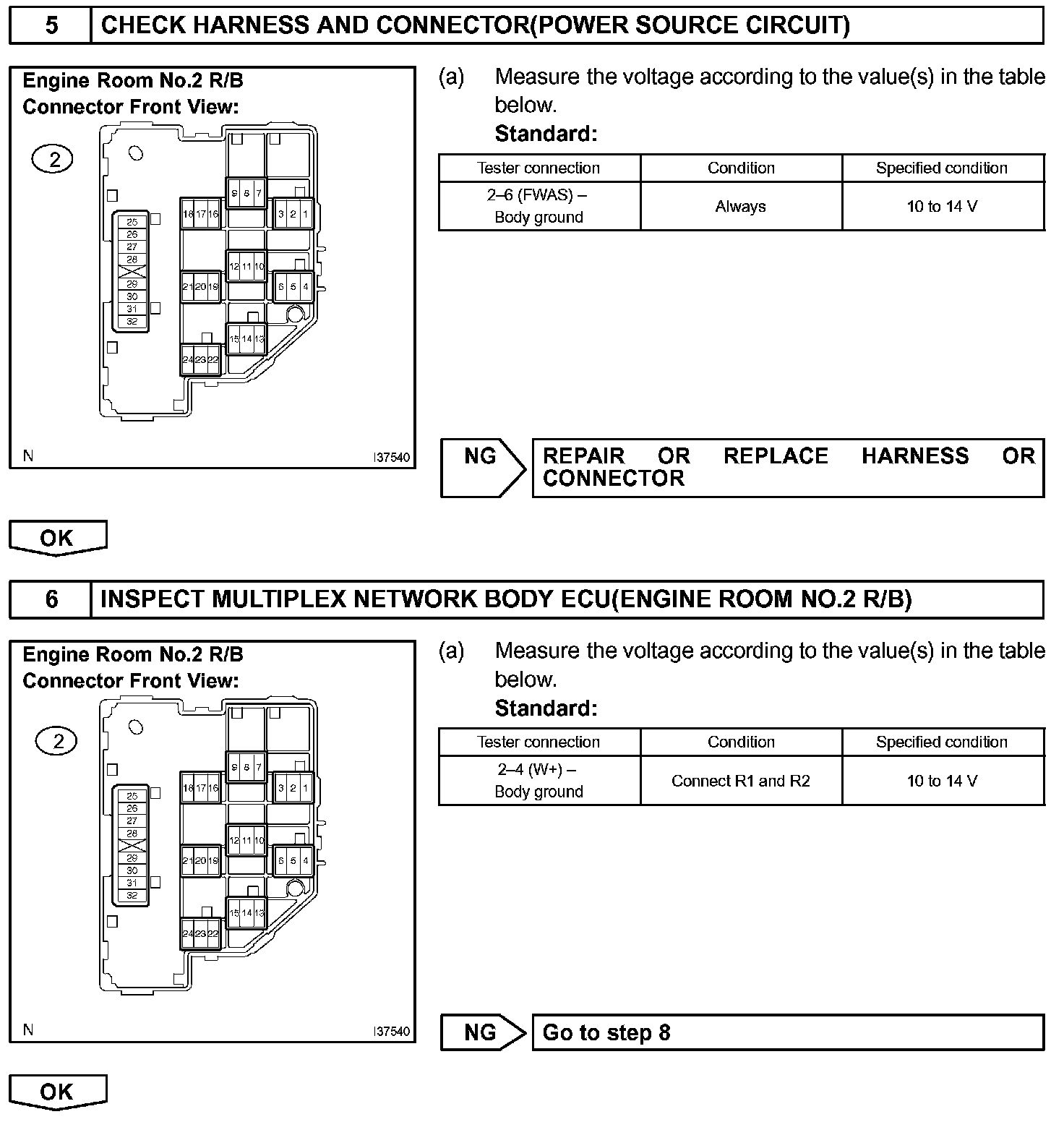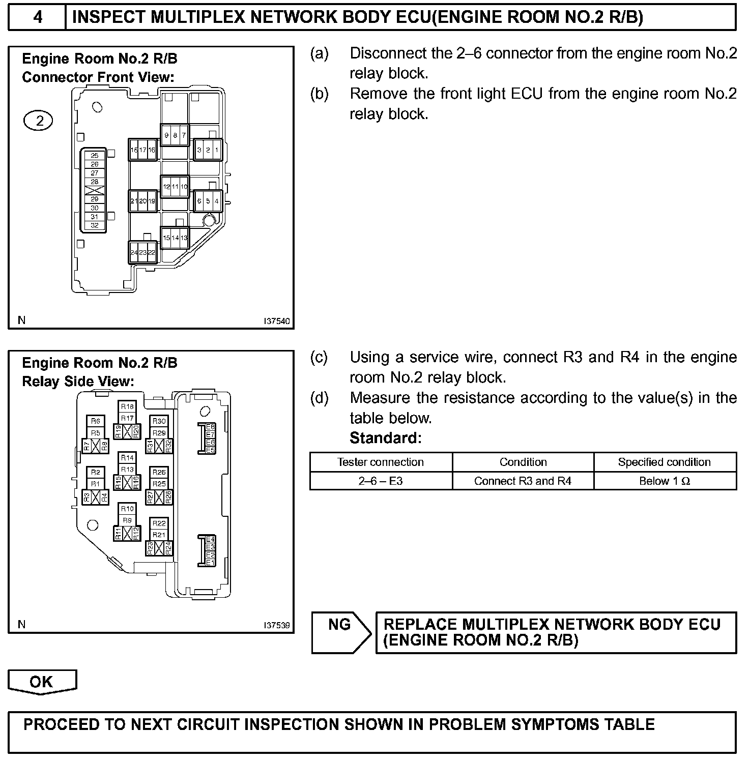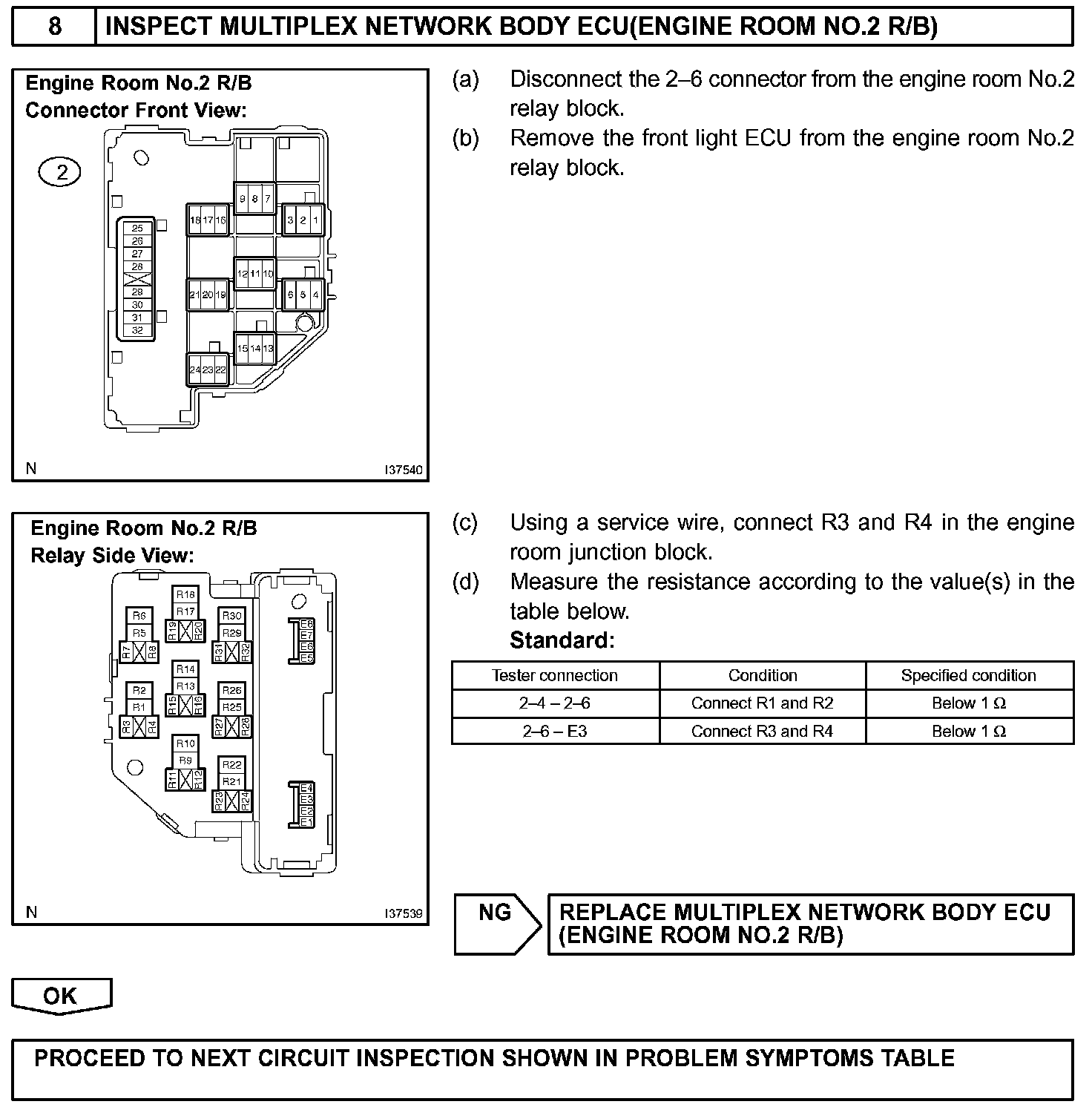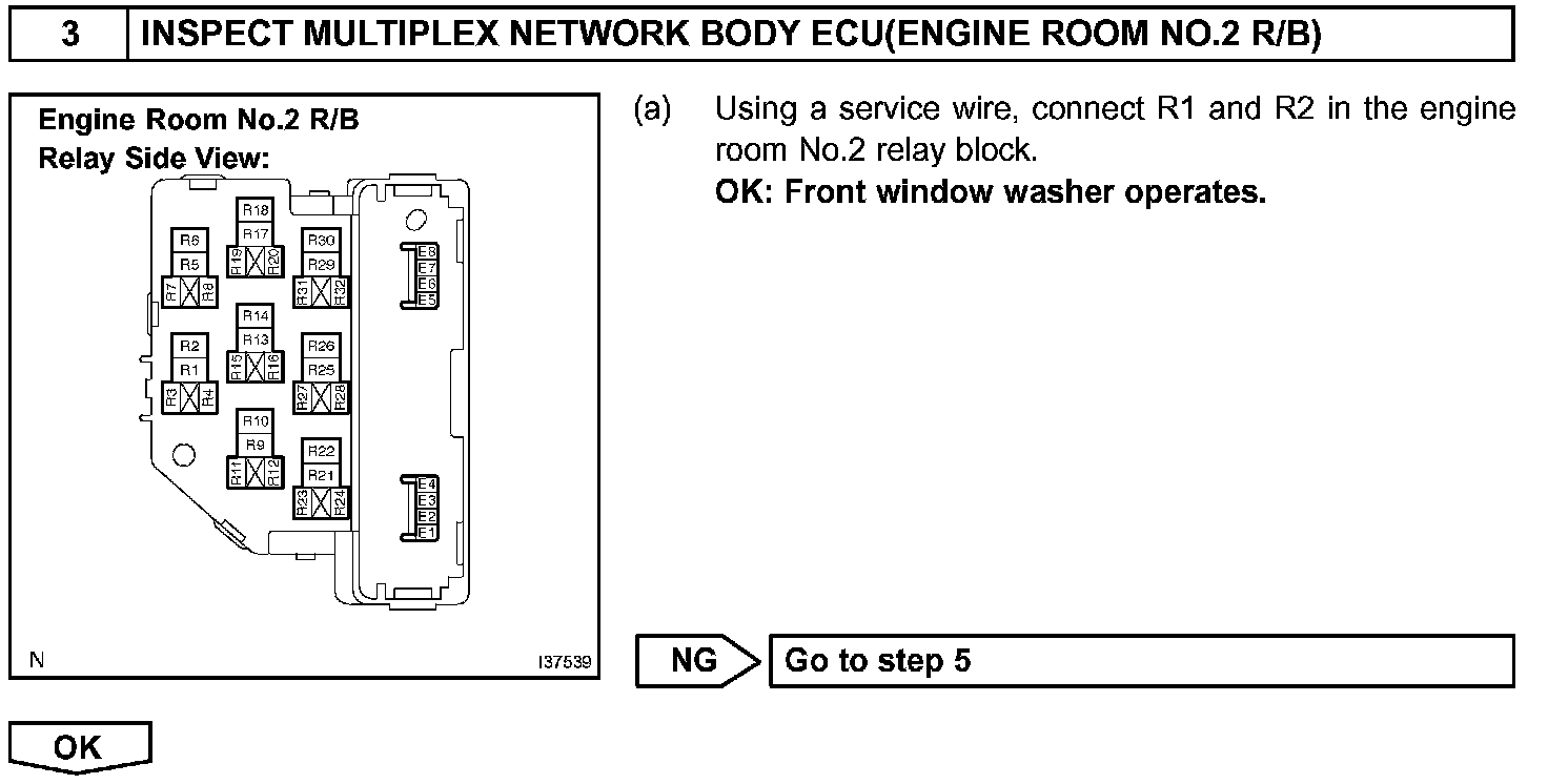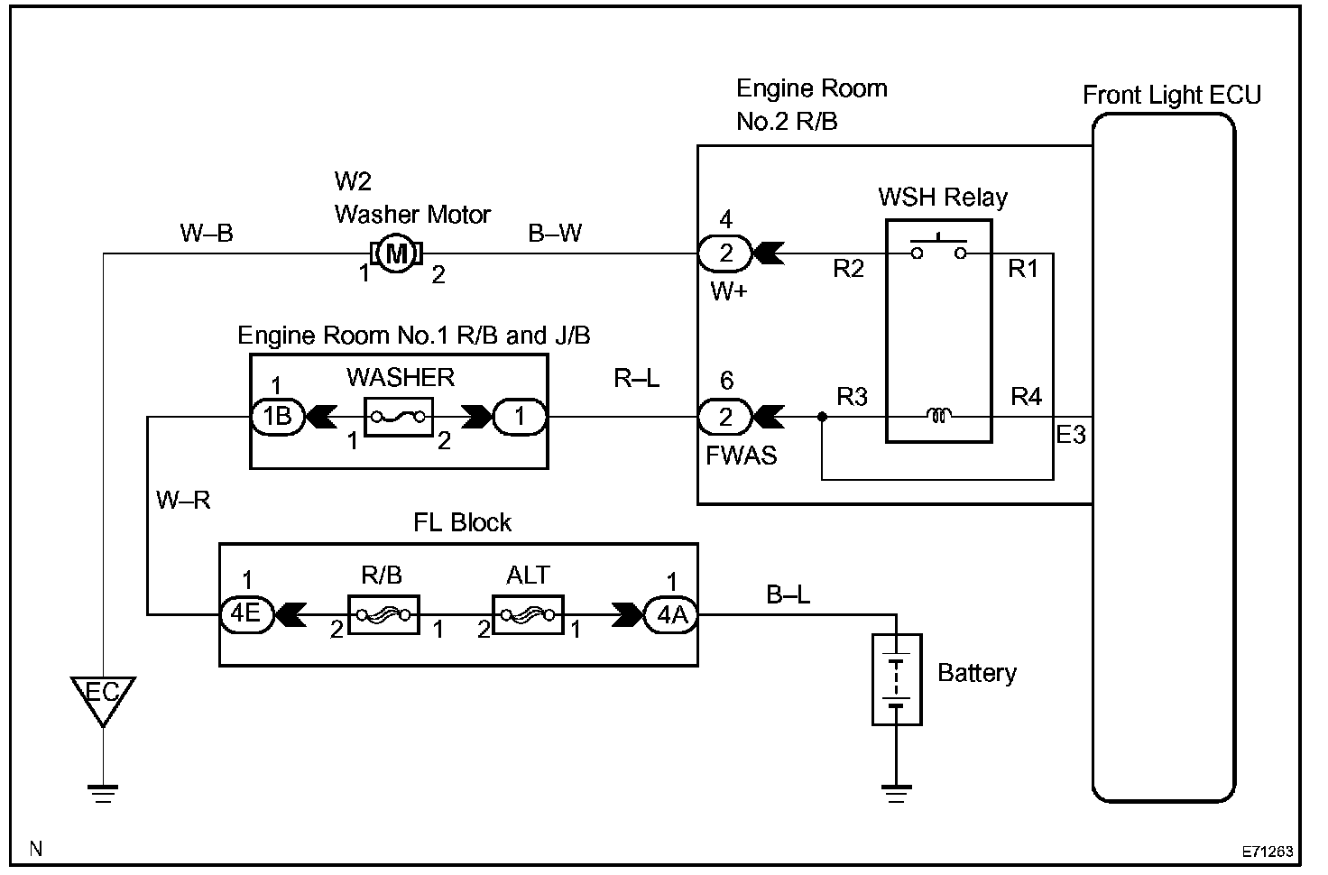 The front light ECU receives washer switch information from the combination switch, and operates the washer relay.