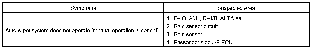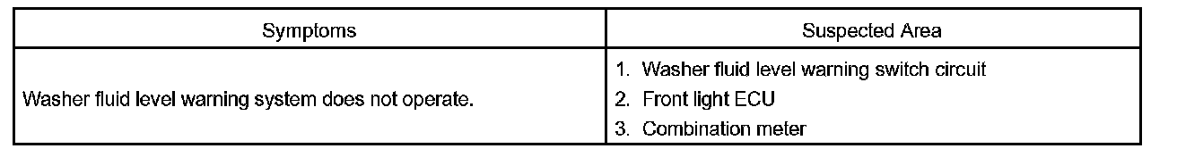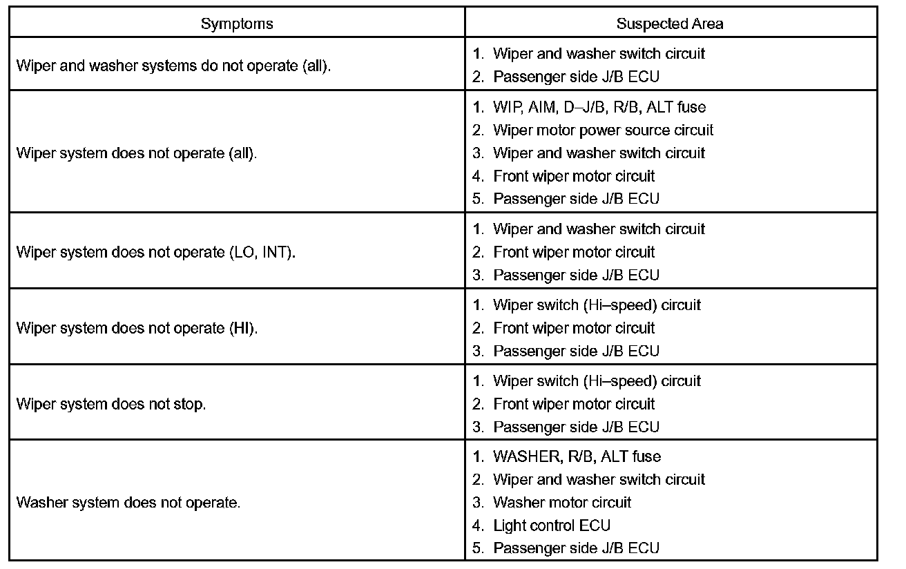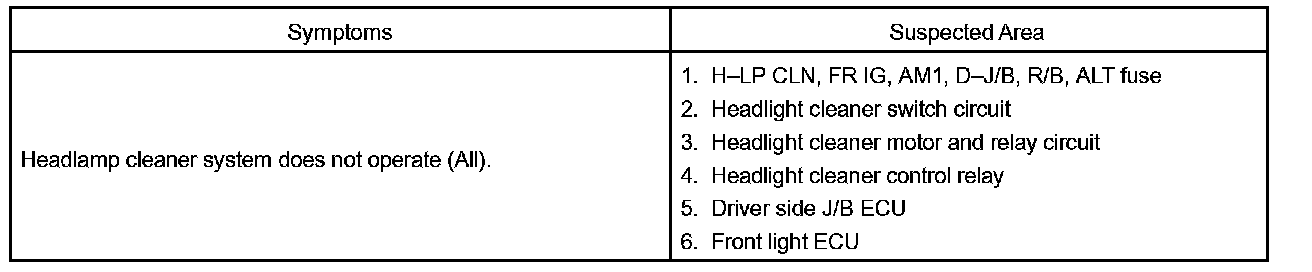 - Inspect the fuse and relay before confirming the suspected area as shown in the tables. Inspect each malfunction circuit in numerical order for the corresponding symptom.