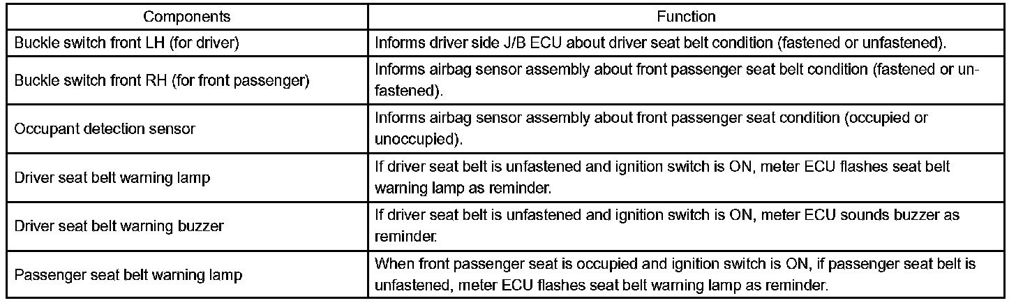 - When the ignition switch is turned ON, this system detects the condition of the seat belts based on the signals from the seat belt buckle switches (for the driver or front passenger) and the occupant detection sensor (only for front passenger).