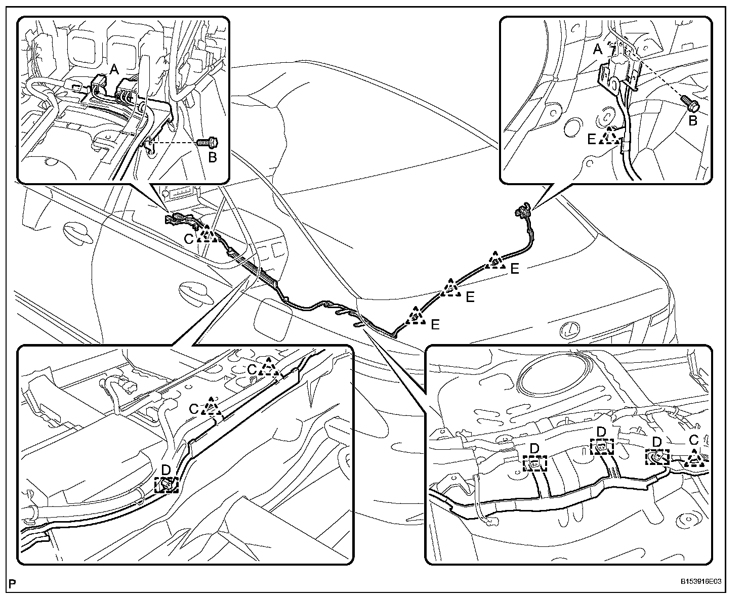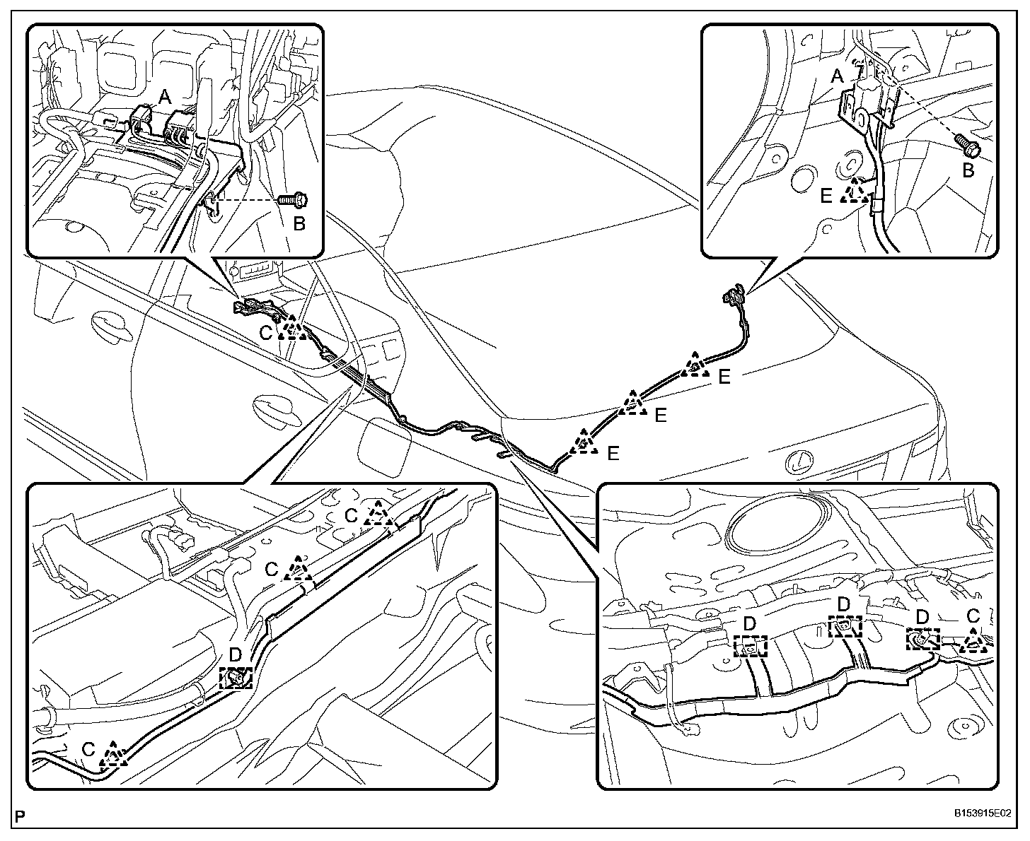 e. Detach the 4 clips labeled E and remove the antenna cord.