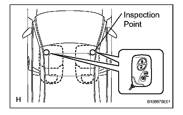 3. Inspect the entry ignition operation's detection area (front seat). Pay attention to the direction of the key in the illustration. When the key is in either of the 2 locations in the illustration, check that the engine can start.