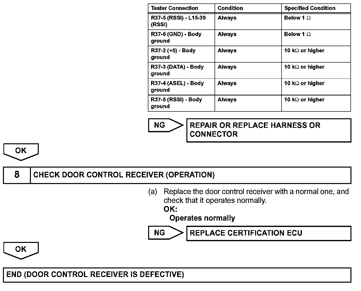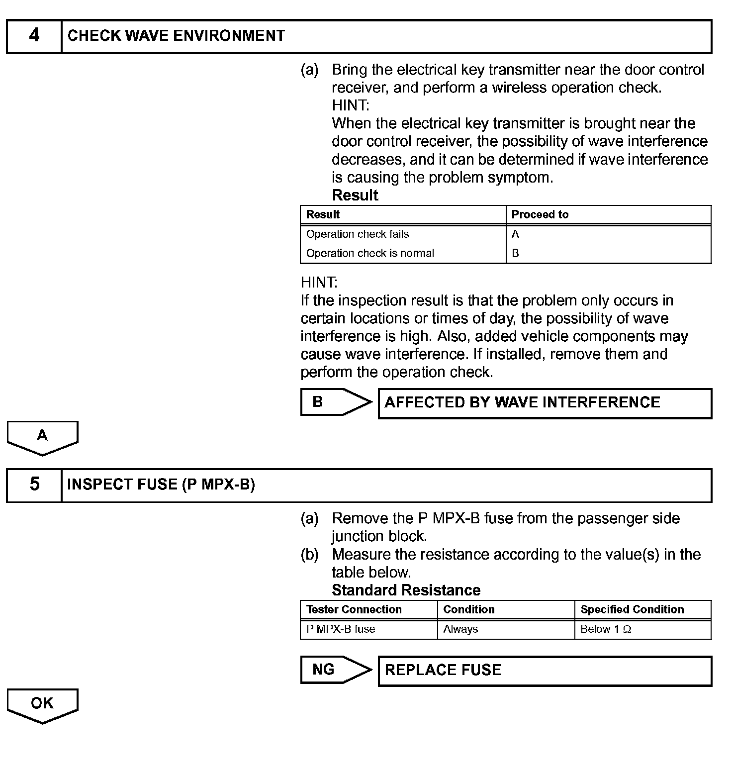 When the entry operation and wireless operation door lock function does not operate, a malfunction or wave interference may be occurring in either of the following: 1) signal communication line between the door control receiver and certification ECU (line is used by entry and wireless); or 2) electrical key transmitter.
