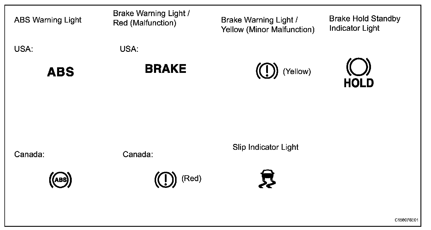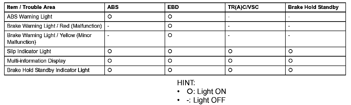 a. If the skid control ECU detects a malfunction, it will warn the driver by turning on the ABS warning light, brake warning light / red (malfunction) and brake warning light / yellow (minor malfunction) and slip and brake hold standby indicator light. It also warns the driver with the indication on the multi-information display.