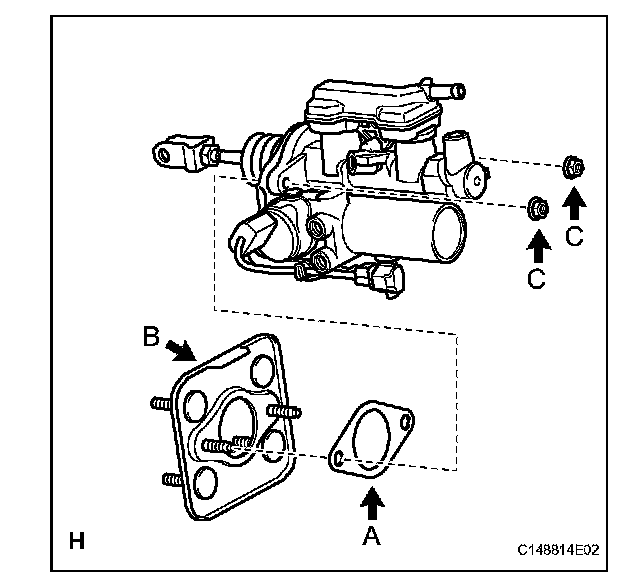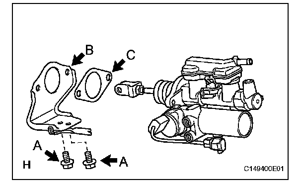(a) Install a new brake master cylinder gasket (labeled A) and brake master cylinder bracket (labeled B) to the brake master cylinder with simulator with the 2 nuts (labeled C).