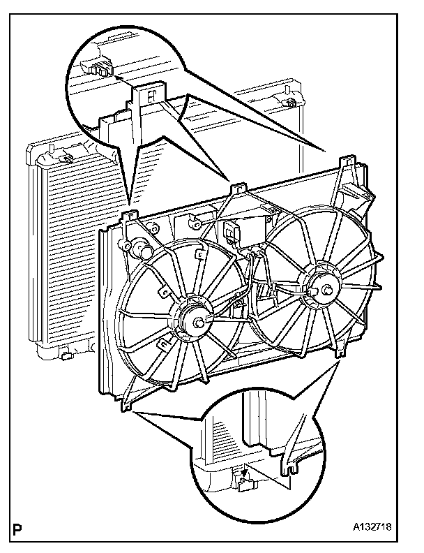 (a) Set the fan shroud with fan and motor to the radiator, and attach the 3 claws to install the fan shroud.