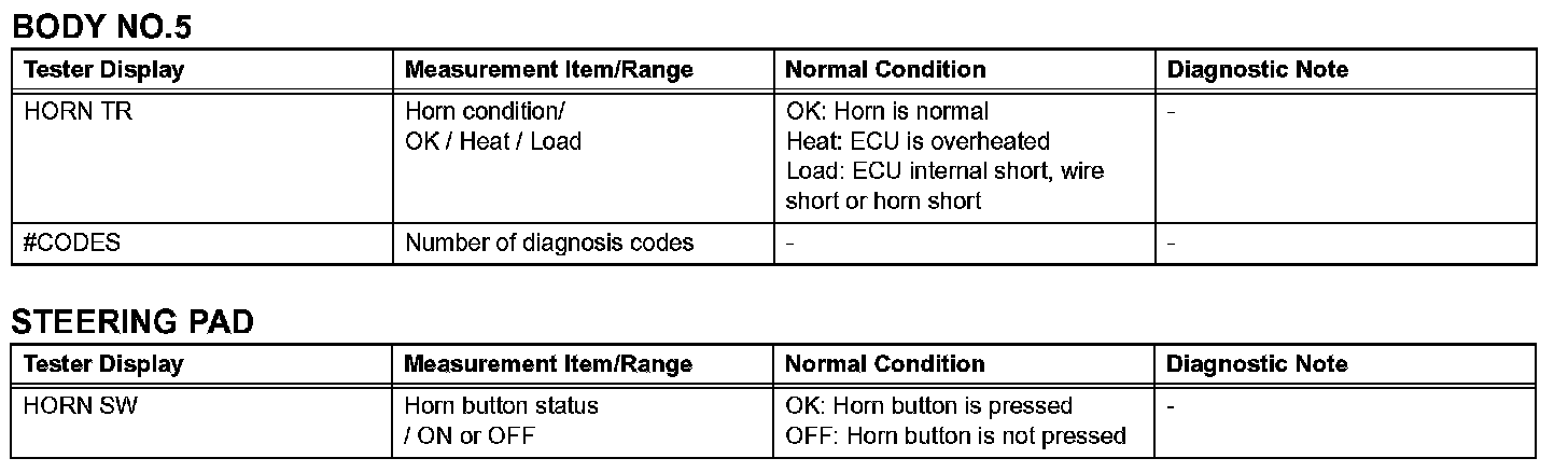 NOTE: In the table given, the values listed under "Normal Condition" are reference values. Do not depend solely on these reference values when deciding whether a part is faulty or not.