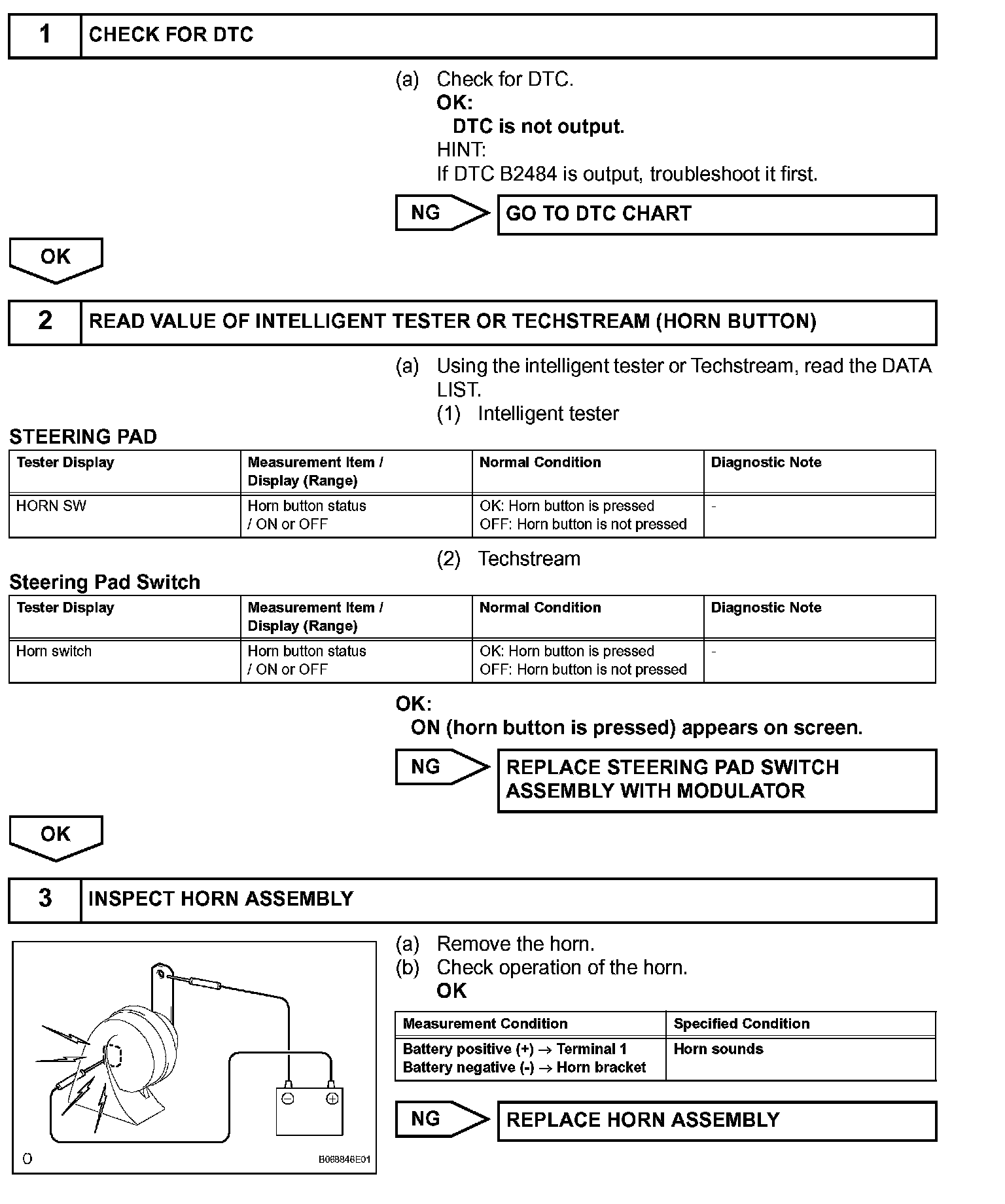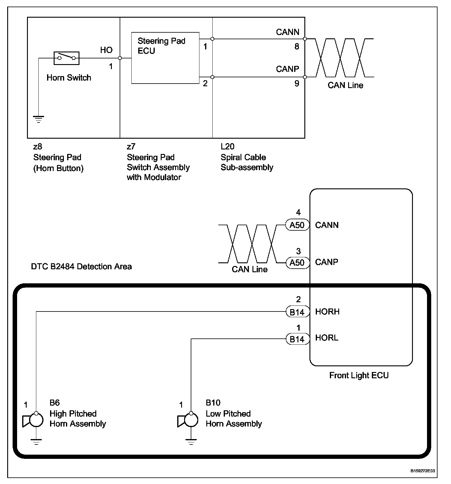When the steering pad (horn button) is pressed, a signal is sent from the steering pad through the steering pad switch with modulator (steering pad ECU) to the spiral cable. The spiral cable and front light ECU (front controller) communicate via the CAN line. The front light ECU receives the signal and sends it to the vehicle horns, causing the horns to sound.
