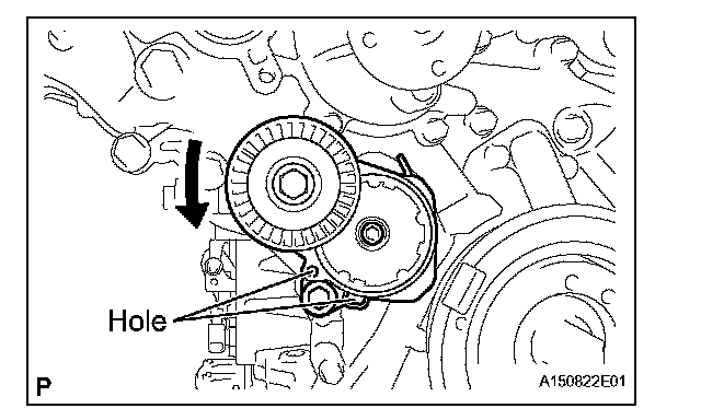 (1) While turning the belt tensioner counterclockwise, align the holes. Insert a bar of Diameter 5 mm (0.20 in.) into the holes to fix the belt tensioner in place.