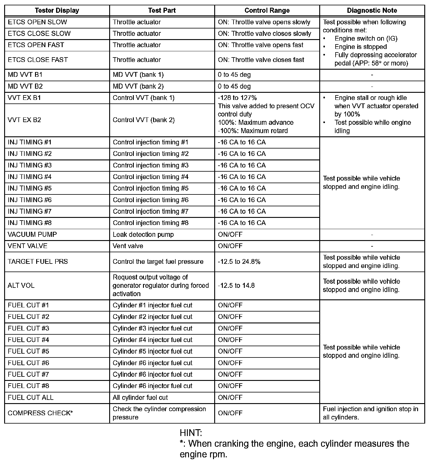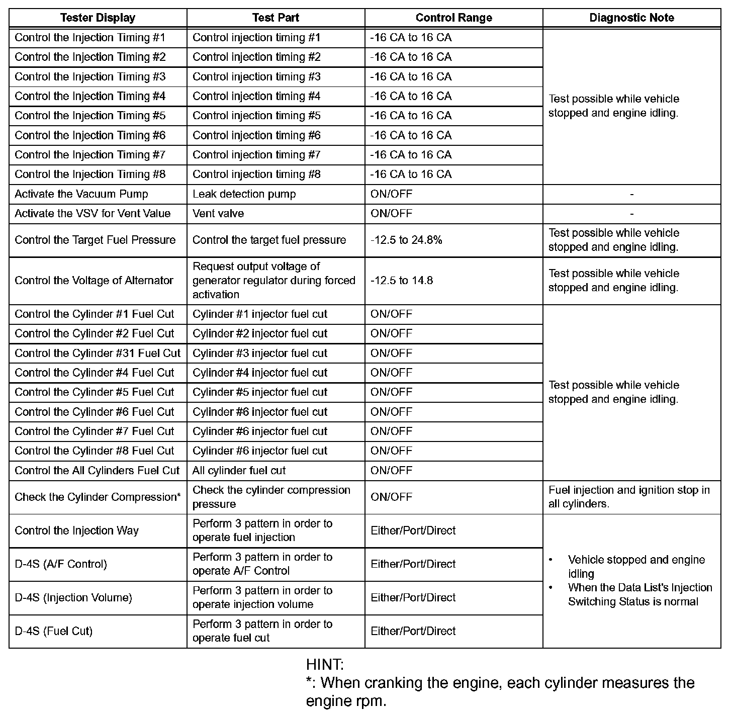 In this Active Test, the fuel and ignition of all cylinders are cut, and cranking occurs for approximately 10 seconds. Then, each cylinder measures the engine rpm. If a cylinder's engine rpm is higher than the other, that cylinder's compression pressure is compared to the other, and is determined whether it is low or not.