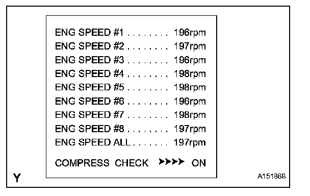 HINT: After performing the procedure, the ACTIVE TEST's COMPRESS CHECK will start. Fuel injection for all cylinders is prohibited, and each cylinder's engine rpm measurement will enter standby mode.