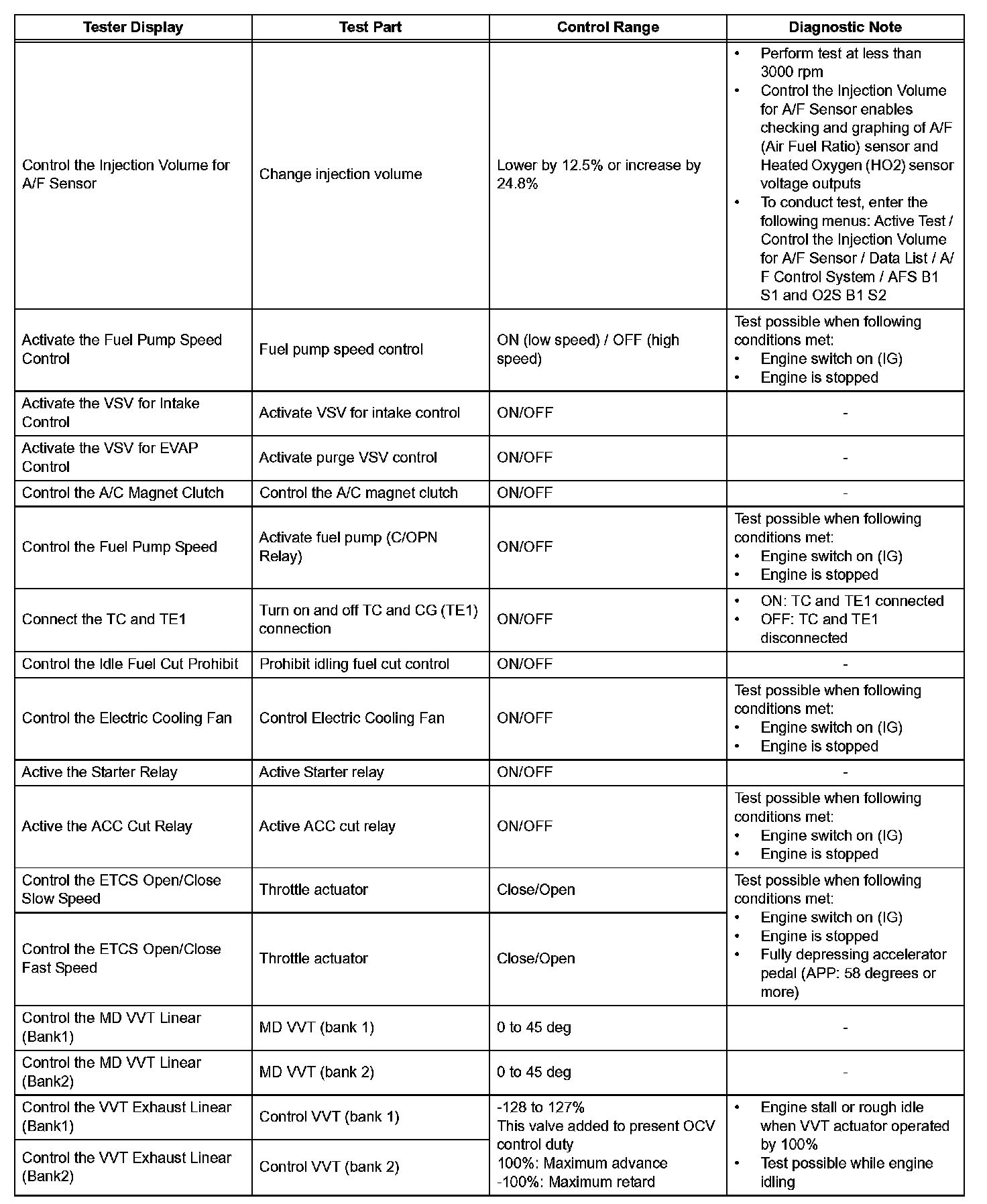 ACTIVE TESTHINT: Using the intelligent tester or Techstream to perform the Active Tests allows relays, VSVs and actuators and other items to be operated without removing any parts. This non-intrusive functional inspection can be very useful because intermittent operation may be discovered before parts or wiring is disturbed. Performing Active test early in troubleshooting is one way to save diagnostic time. Data List information can be displayed while performing Active Tests.