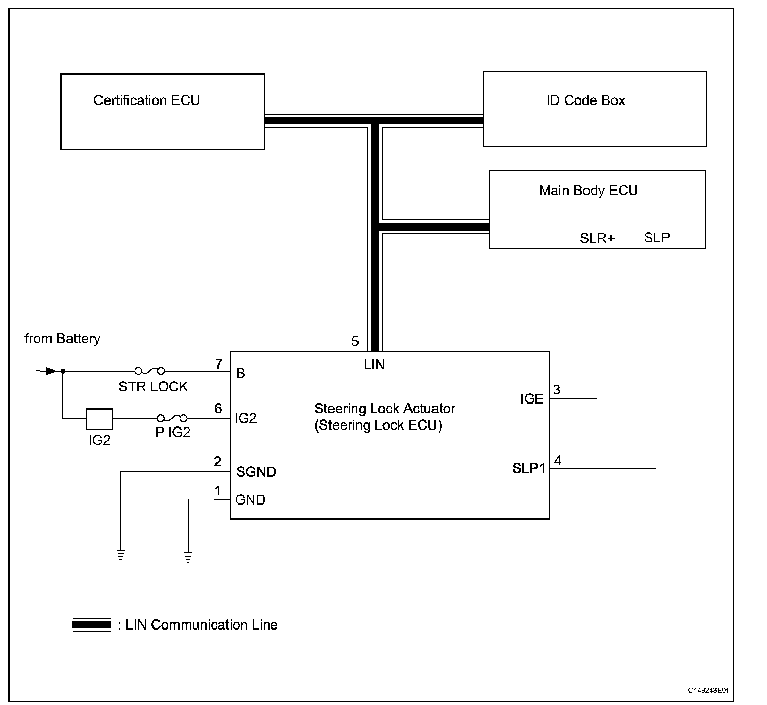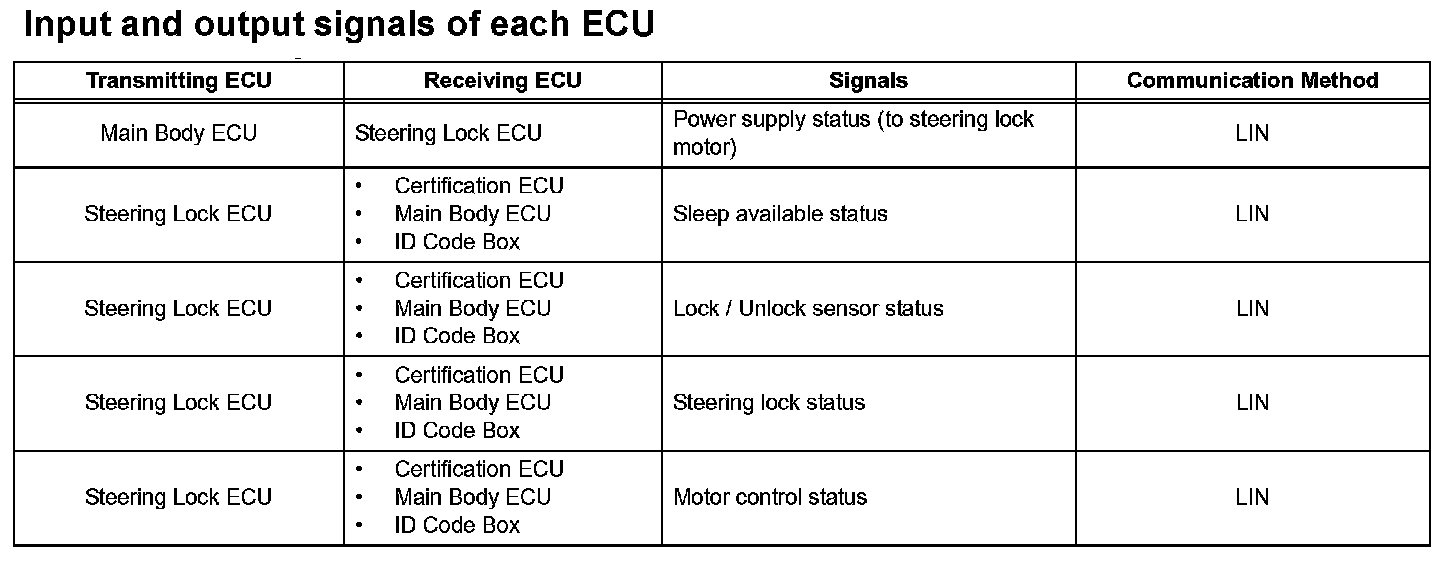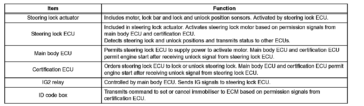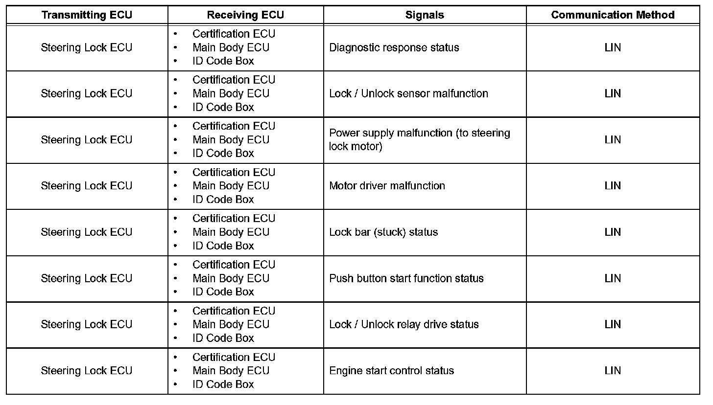 (a) The steering lock system locks and unlocks the steering lock by activating the steering lock bar with a motor. The steering lock ECU activates the motor based on permission signals from the certification ECU and main body ECU.