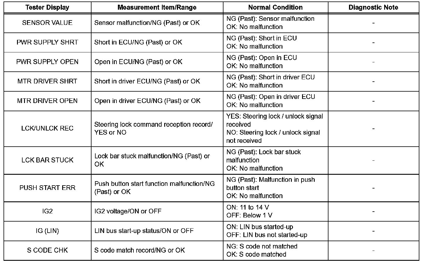 NOTICE: In the table, the values listed under "Normal Condition" are reference values. Do not depend solely on these reference values when deciding whether a part is faulty or not.