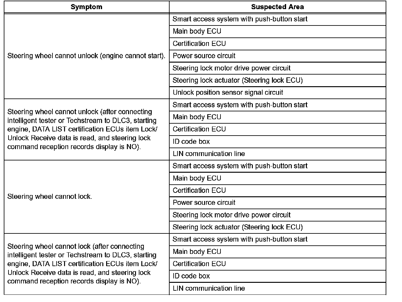 PROBLEM SYMPTOMS TABLEHINT: Use the table to help determine the cause of the problem symptom. The potential causes of the symptoms are listed in order of probability in the "Suspected Area" column of the table. Check each symptom by checking the suspected areas in the order they are listed. Replace parts as necessary.