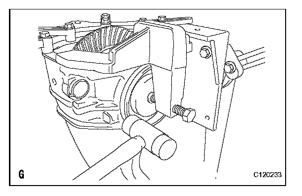 (f) Tap the differential carrier on the ring gear tooth side using a plastic-faced hammer to stabilize the case bearing.