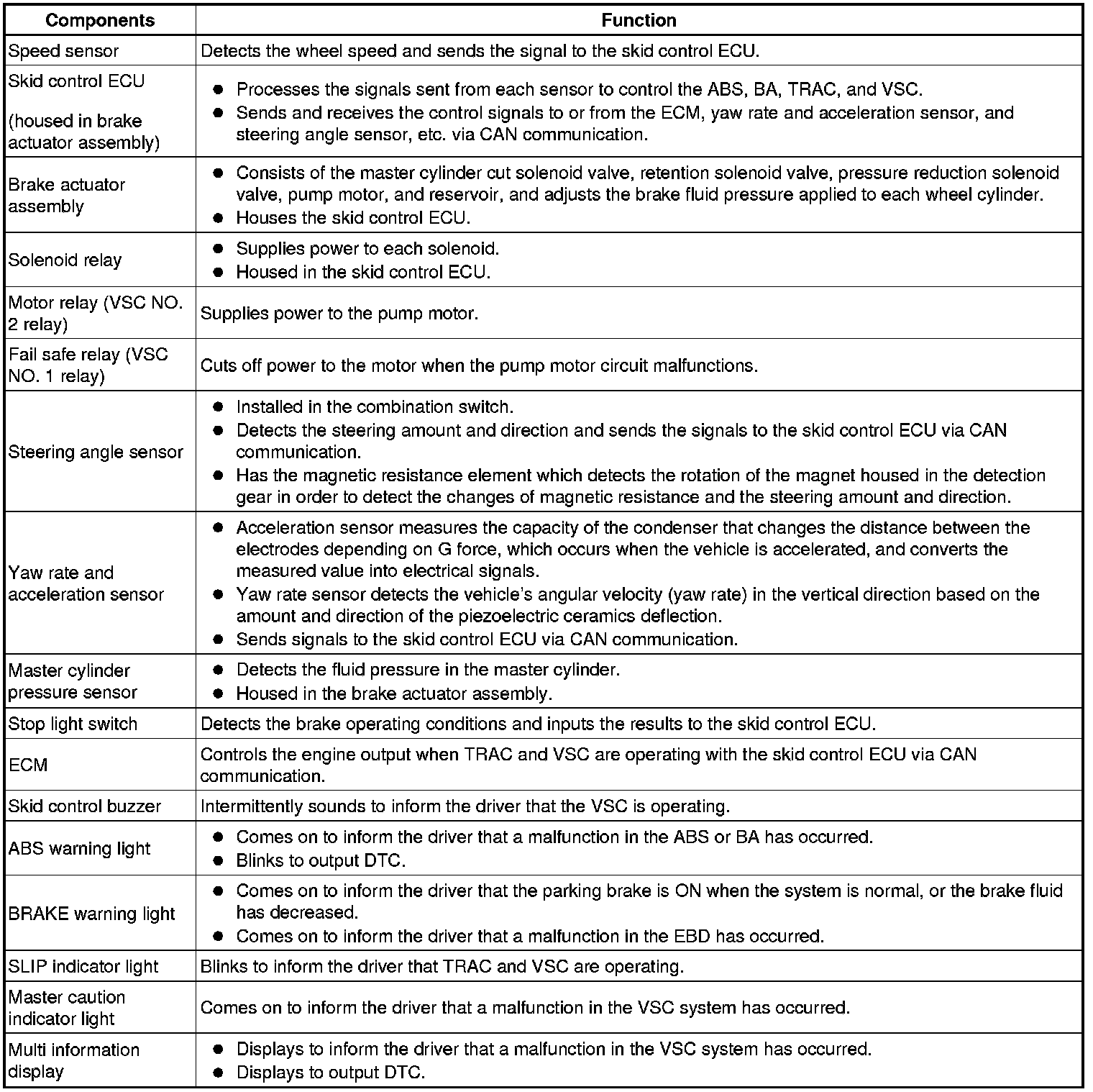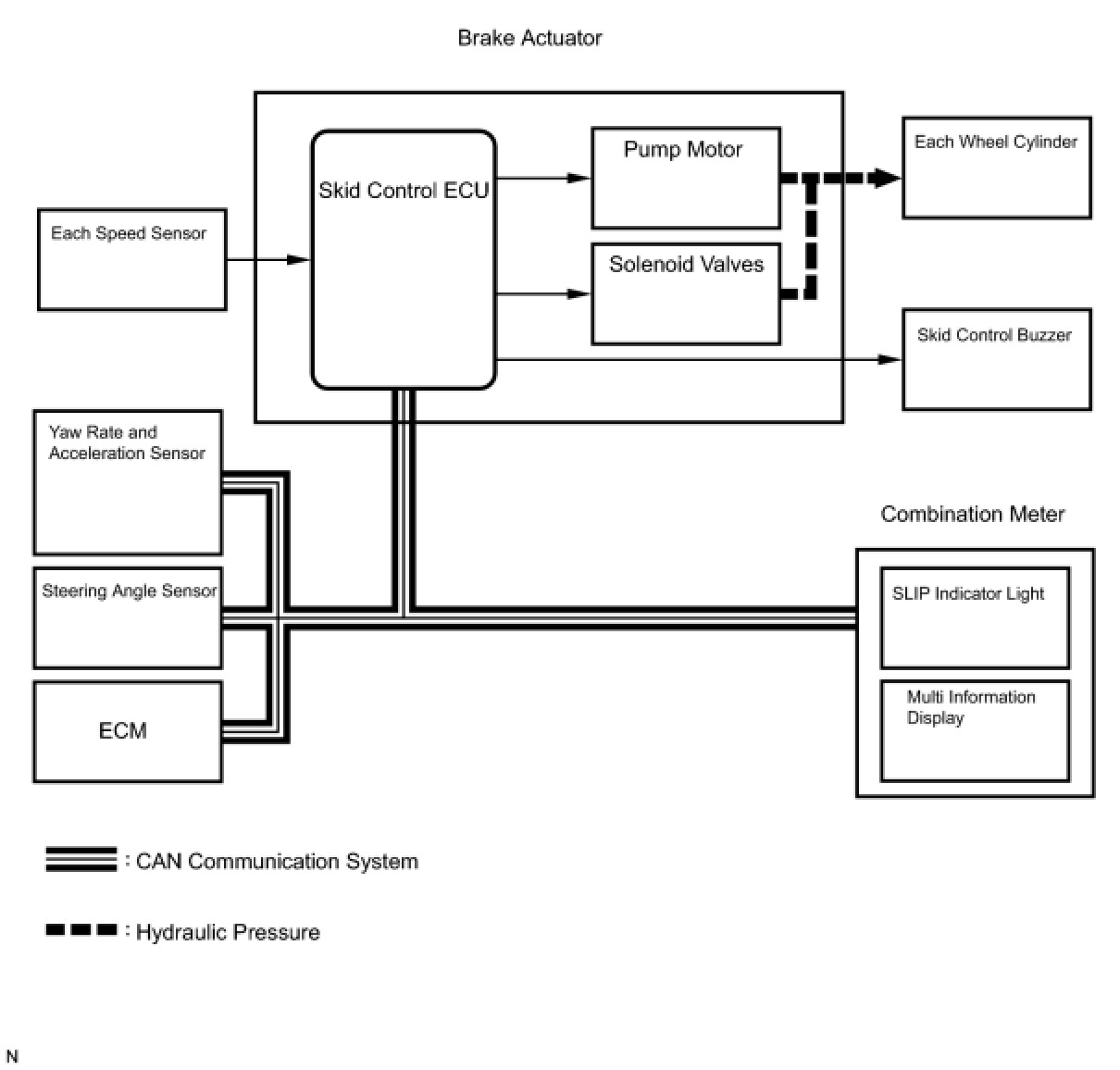 The skid control ECU determines the vehicle operating conditions based on signals received from the wheel speed sensors, yaw rate and acceleration sensor, and steering angle sensor. The skid control ECU sends signals via CAN communication to the ECM in order to control engine torque. The skid control ECU controls brake hydraulic pressure using the pump and solenoid valves.
