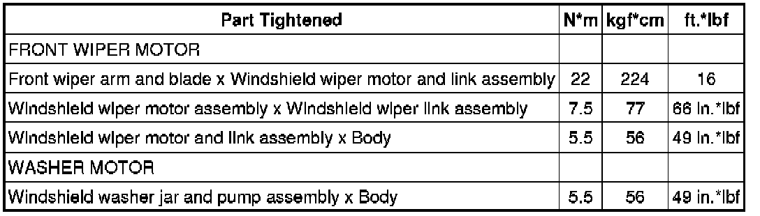 SPECIFICATIONS: WIPER / WASHER: TORQUE SPECIFICATIONS