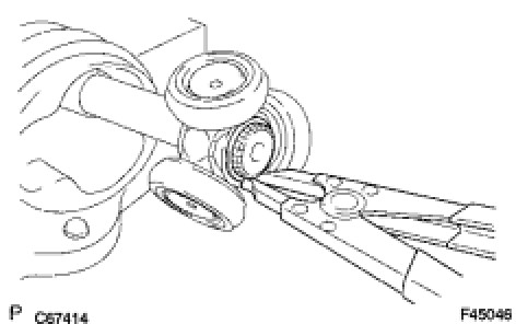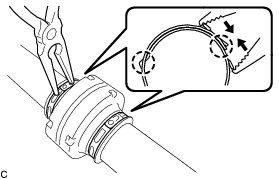 (f) Using a snap ring expander, install a new shaft snap ring to the front axle outboard joint shaft assembly.