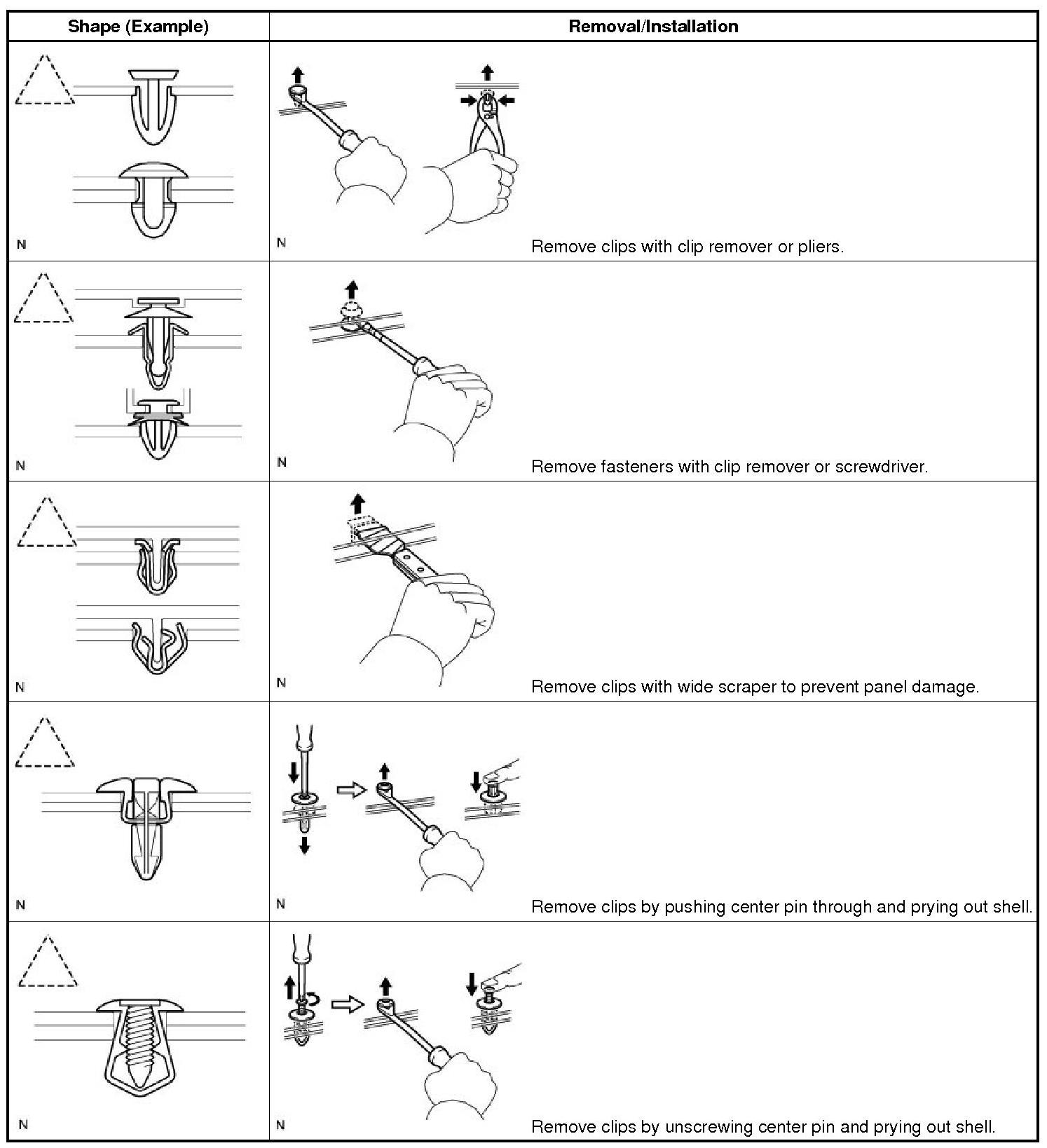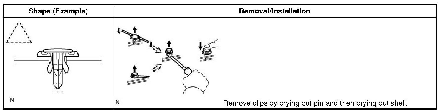 (1) The removal and installation methods of typical clips used for vehicle body parts are shown in the table below.