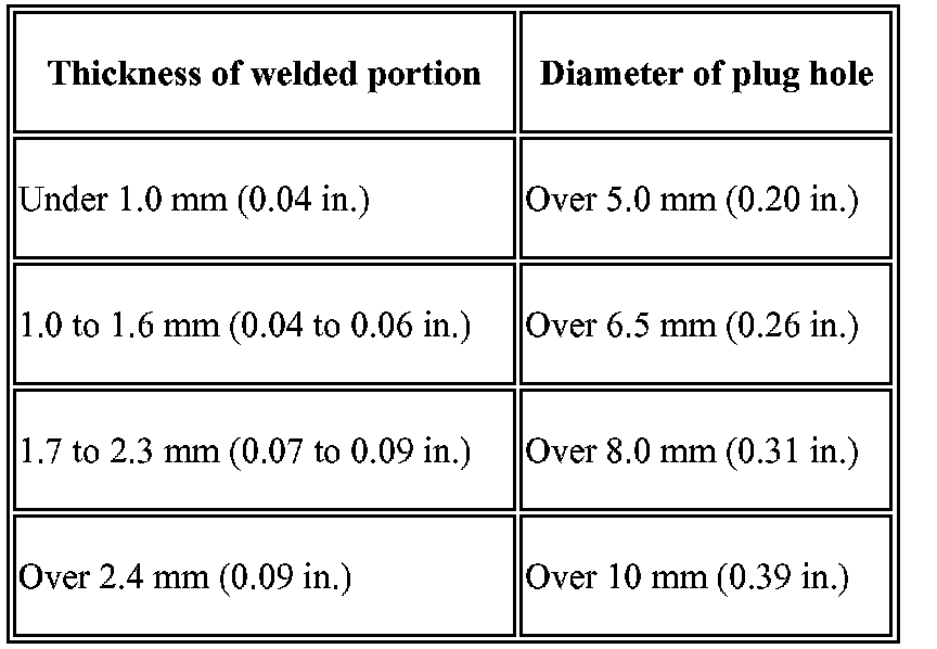 NOTICE: Be sure to use Metal active gas (Ar 80% + CO2 20%) as the shield gas when plug welding. Sufficient weld strength cannot be assured when using 100% CO2 shield gas.
