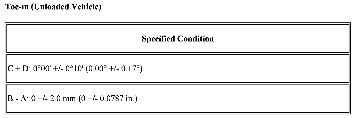 HINT: Camber is not adjustable. If the measurement is not within the specified range, inspect the suspension parts for damage and/or wear, and replace them if necessary.