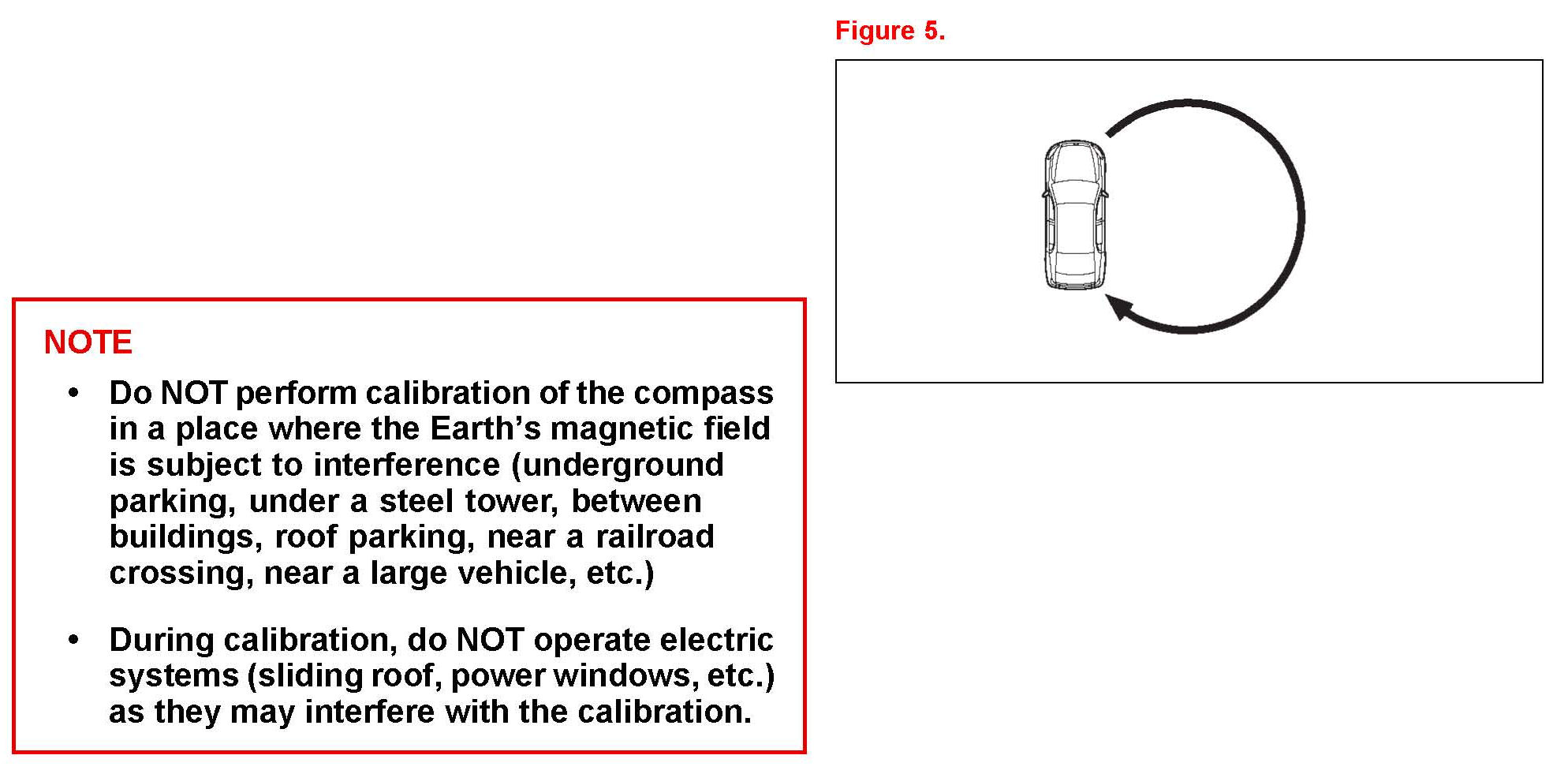 4. Drive the vehicle slowly at 5 mph (8 km/h), or less, in a circle until the direction is displayed. If there is NOT enough space to drive in a circle, drive around the block until the direction is displayed.