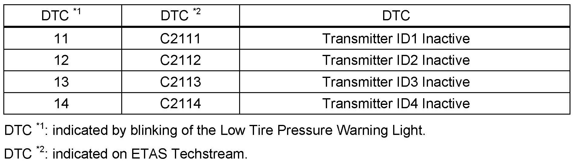 ^ The Diagnostic Trouble Codes (DTCs) listed are stored in the TPWS ECU until the tire pressure warning valves/sensors are activated.