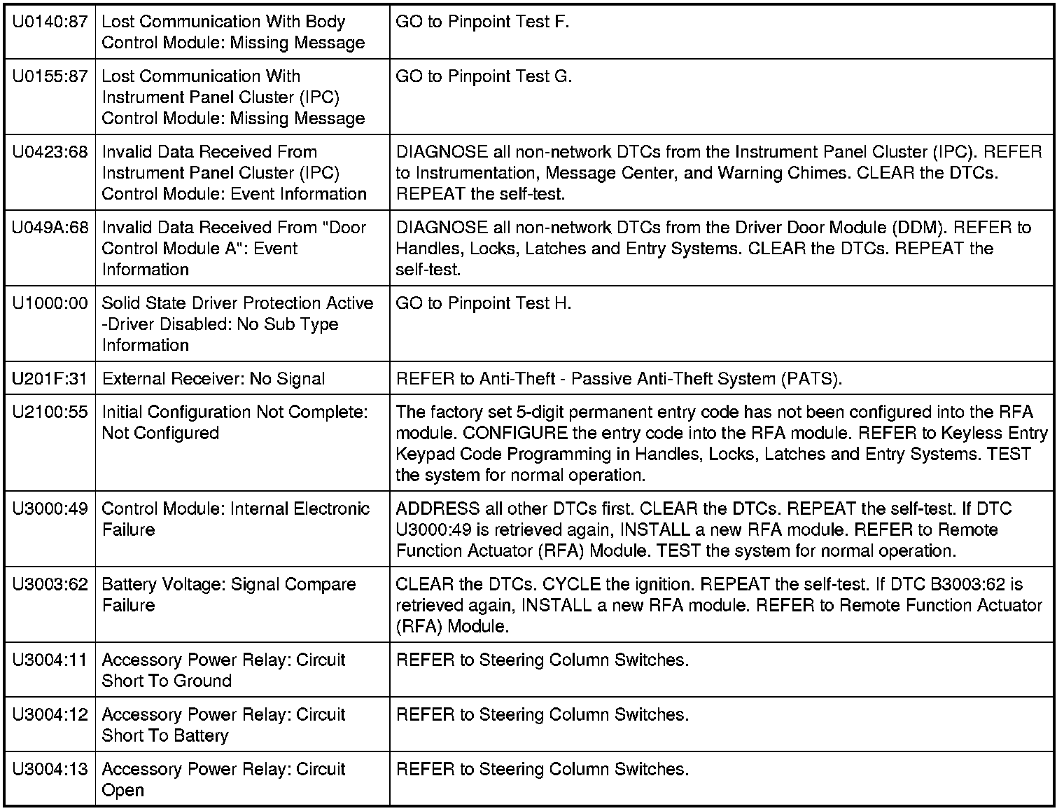 Remote Function Actuator (RFA) Module DTC Chart