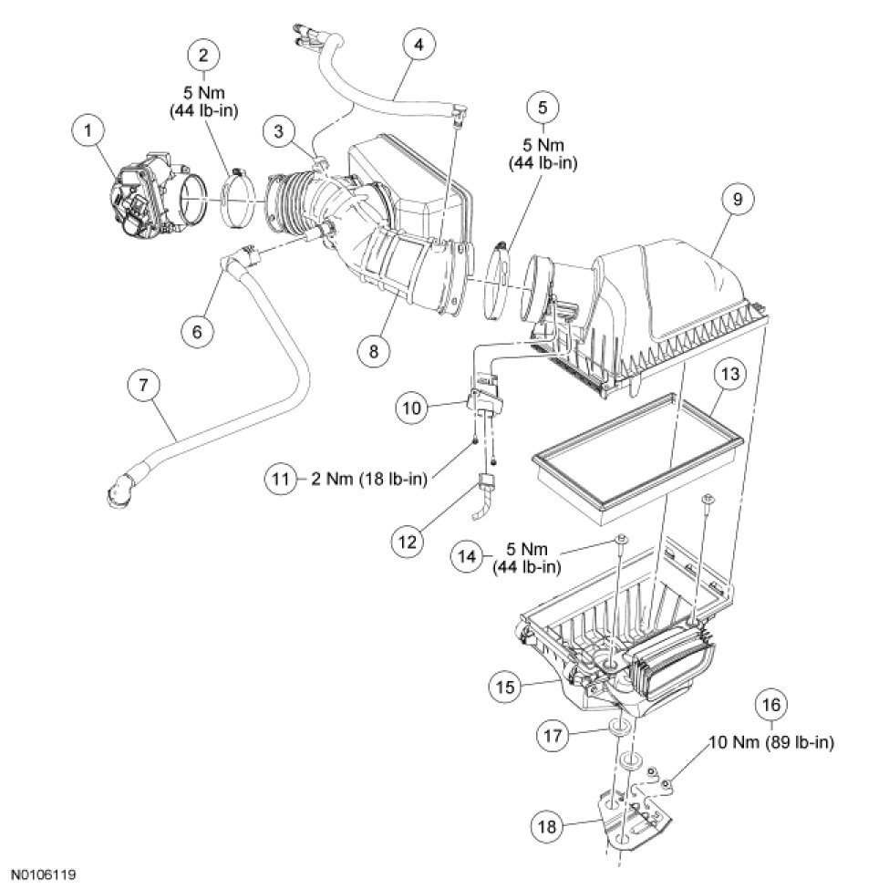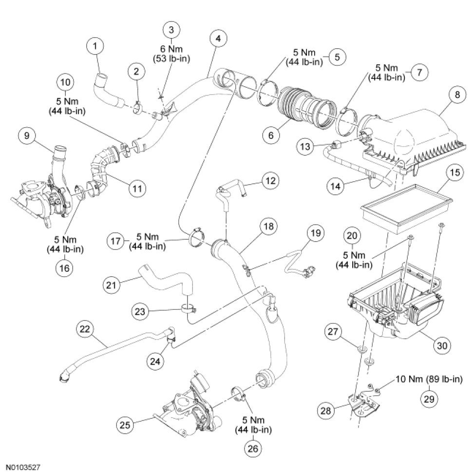NOTICE: Whenever turbocharger air intake system components are removed, always cover open ports to protect from debris. It is important that no foreign material enter the system. The turbocharger compressor vanes are susceptible to damage from even small particles. All components should be inspected and cleaned, if necessary, prior to installation or reassembly.