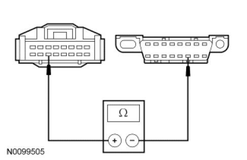 - Measure the resistance between the 4X4 control module C460-3, circuit VDB04 (WH/BU), harness side and the Data Link Connector (DLC) C251-6, circuit VDB04 (WH/BU), harness side.