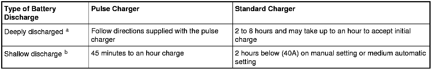 NOTE: Battery chargers have improved greatly with the addition of the new generation pulse chargers. These chargers pulse current into the battery, breaking down the sulfation layer on the battery plates and generally reduce charging times to less than an hour.