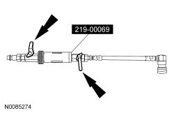 5. Install the dye/lubricant injector between the low-side service gauge port valve and the refrigerant service station or manifold gauge set.