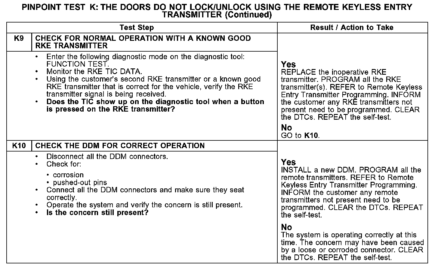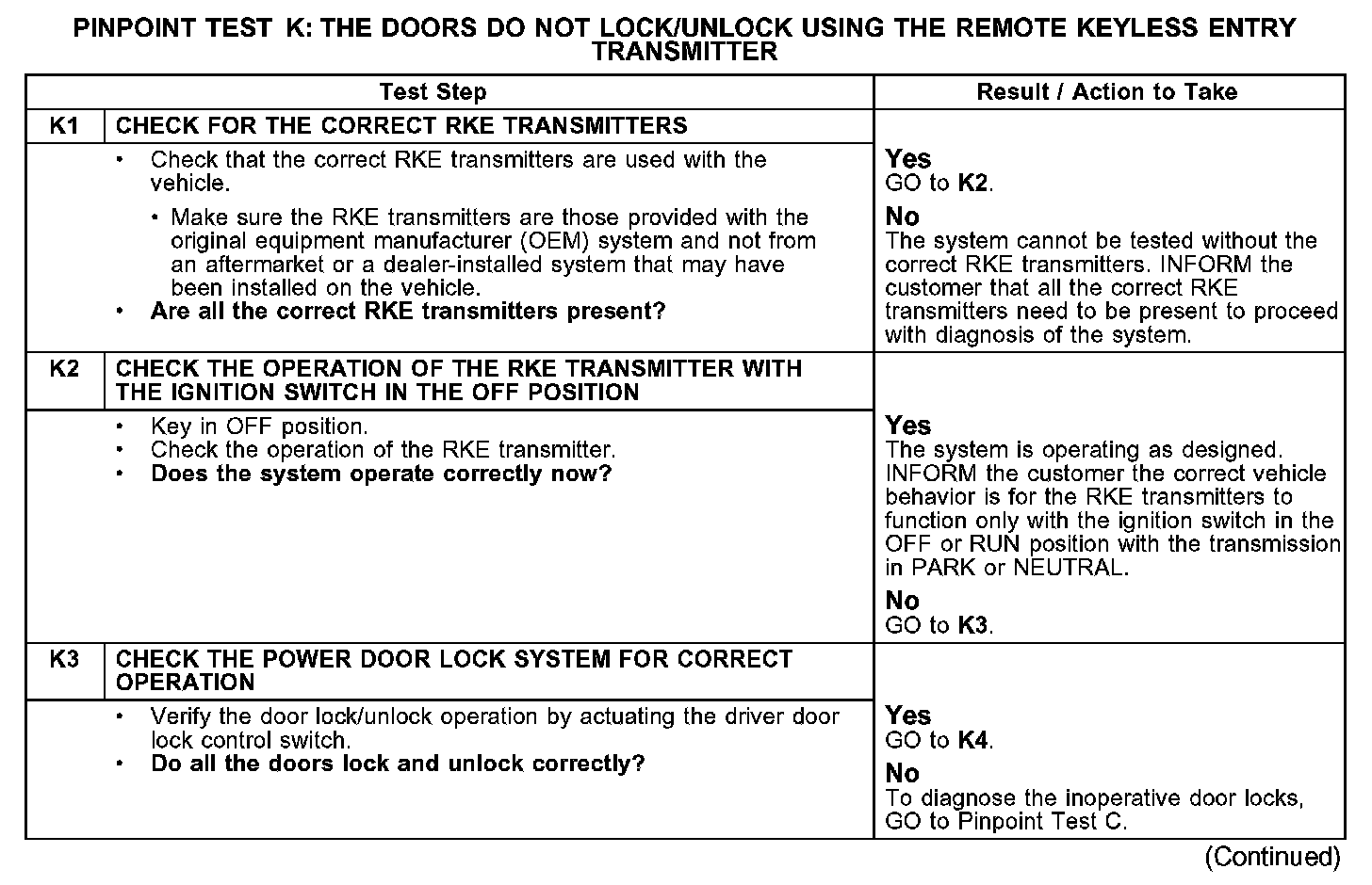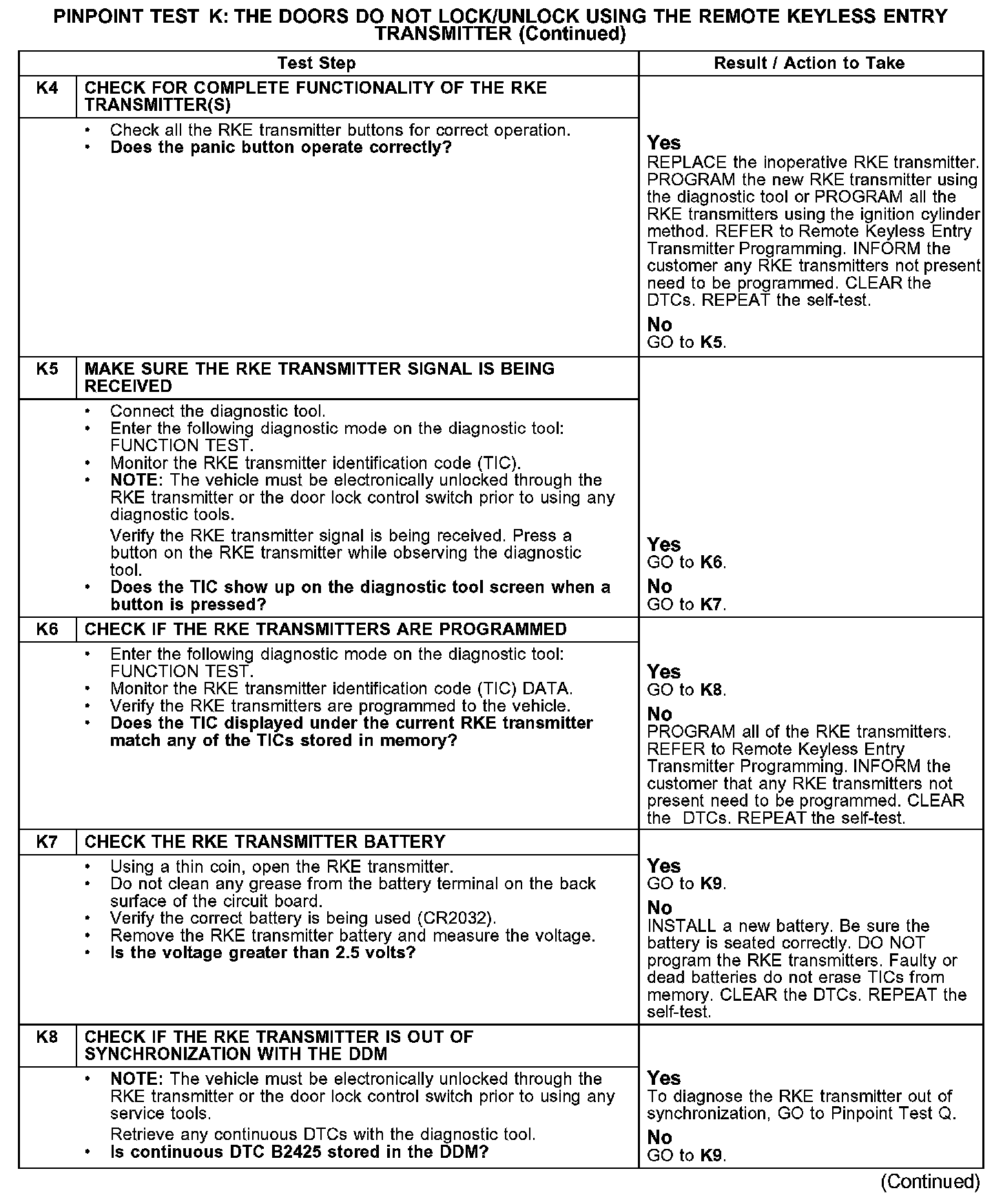 PINPOINT TEST K: THE DOORS DO NOT LOCK/UNLOCK USING THE REMOTE KEYLESS ENTRY TRANSMITTER