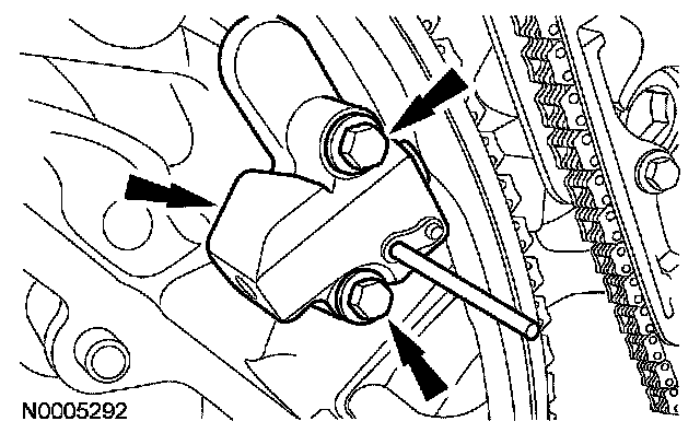 42. Install the RH timing chain tensioner. Install the timing chain tensioner and bolts, and remove the drill rod.