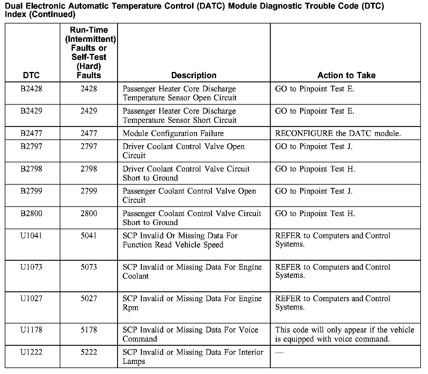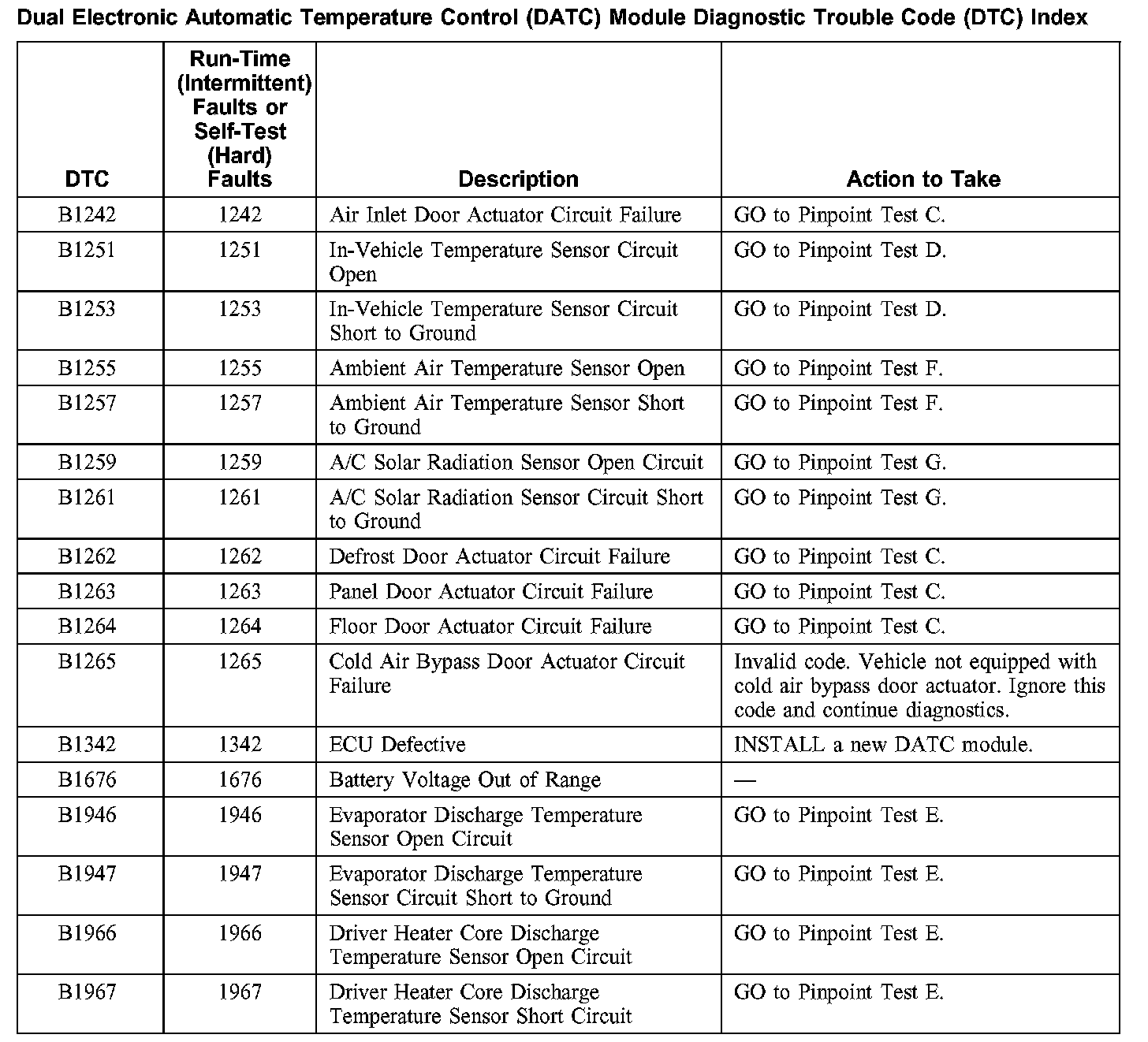 Dual Electronic Automatic Temperature Control (DATC) Module Diagnostic Trouble Code (DTC) Index